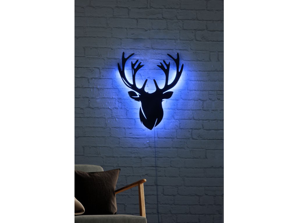 Černý stín jelení hlavy s parožím podsvícený modrým světlem dodá do interiéru atmosféru lesních strážců.