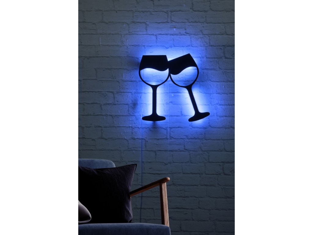 Z kvalitní černé MDF desky vyrobená nástěnná dekorace ve tvaru dvou skleniček je zvýrazněná modrým LED podsvícením.