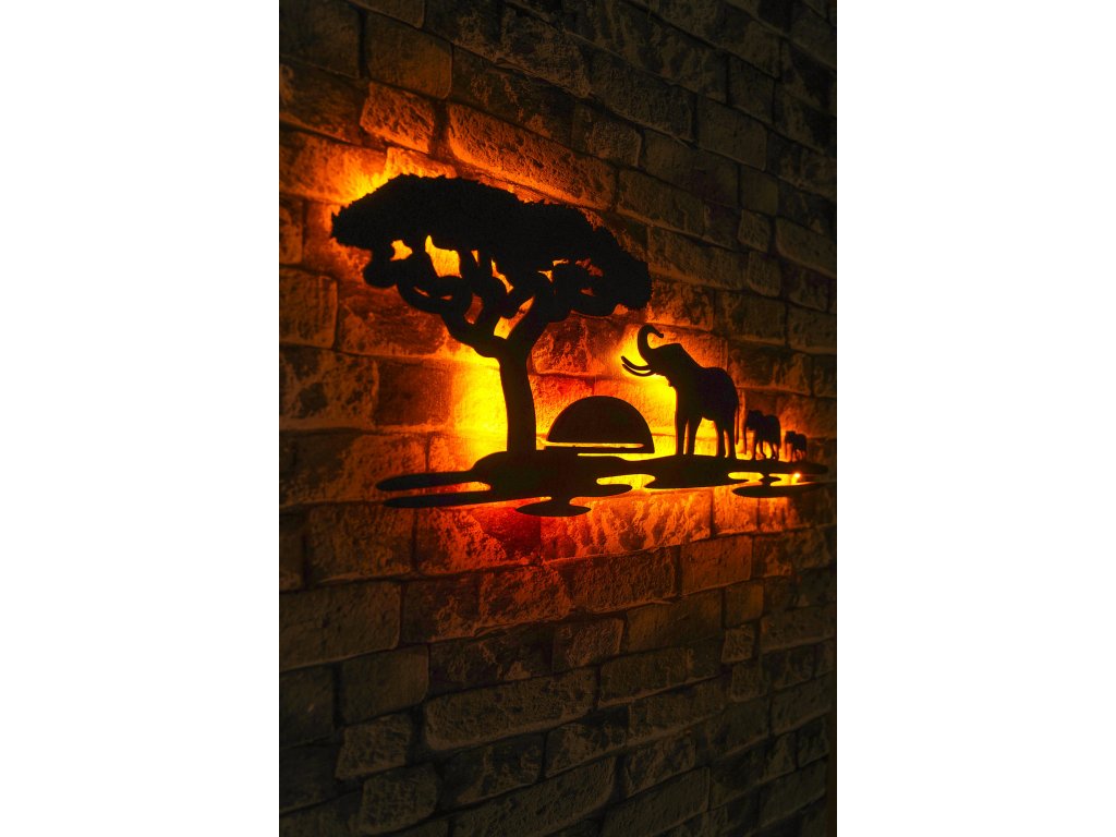 Silueta africké přírody se slony je efektivně podsvícená žlutým LED světlem a dodá každému interiéru romantický nádech často spojovaný se západem slunce.