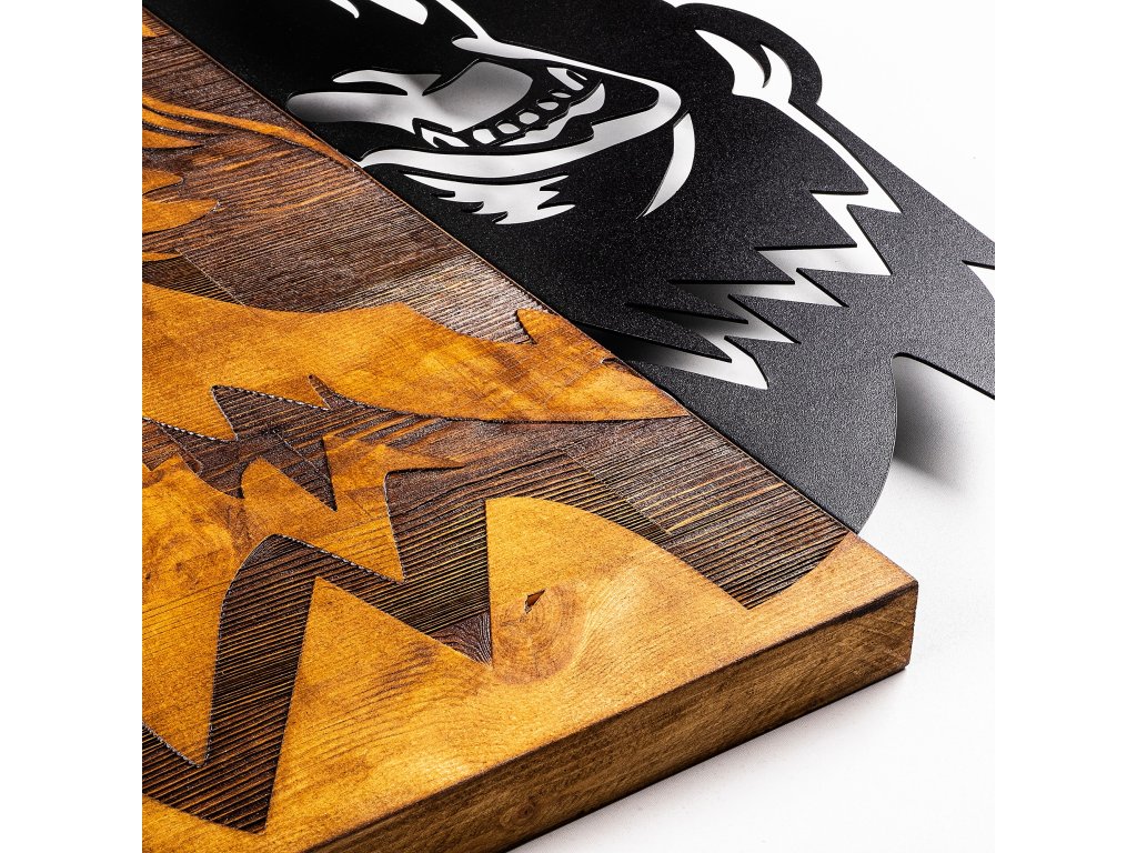 Povšimněte si, že z kovu je pouze pravá část medvěda, na dřevěné desce je medvěd zobrazen jinou technikou.