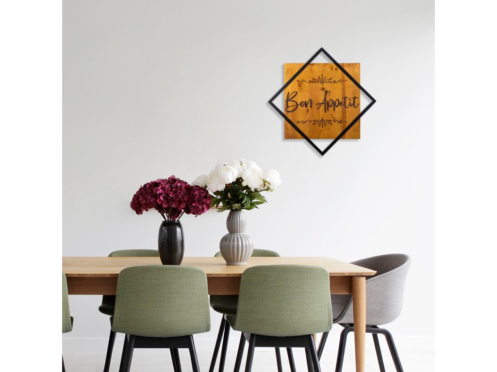Dřevěná nástěnná dekorace s nápisem BON APPETIT je dokonalý vzkaz všem strávníkům.