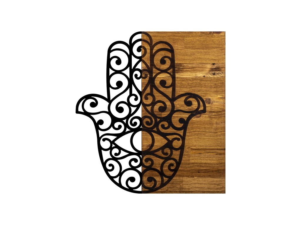 Úžasně propracovaná nástěnná dřevo-kovová dekorace znázorňující černou henou pomalovanou ruku.