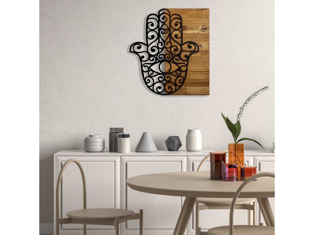 Částečně vypálená do dřevěné tabulky a částečně z kovových plátů vyrobená černá ruka pomalovaná henou může být orientální dekorací ve vašem interiéru.