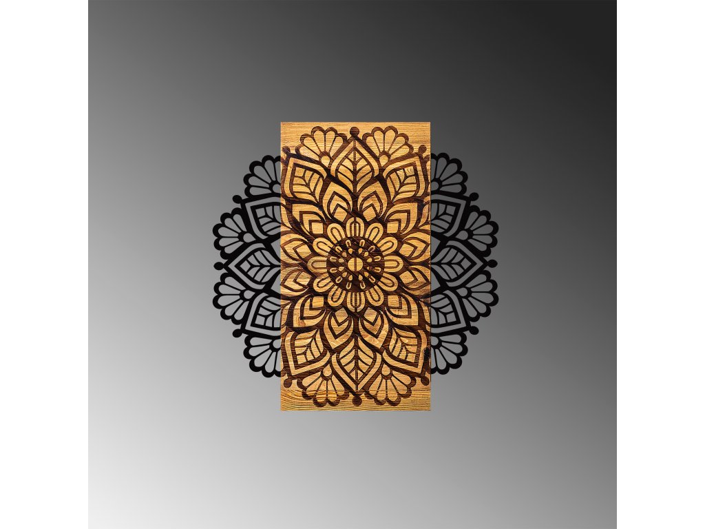Úžasně propracovaná nástěnná dřevo-kovová dekorace znázorňující černou mandalu.