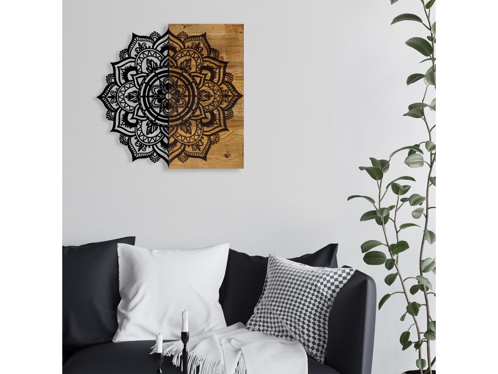 Částečně vypálená do dřevěné tabulky a částečně z kovových plátů vyrobená černá mandala může být orientální dekorací ve vašem interiéru.