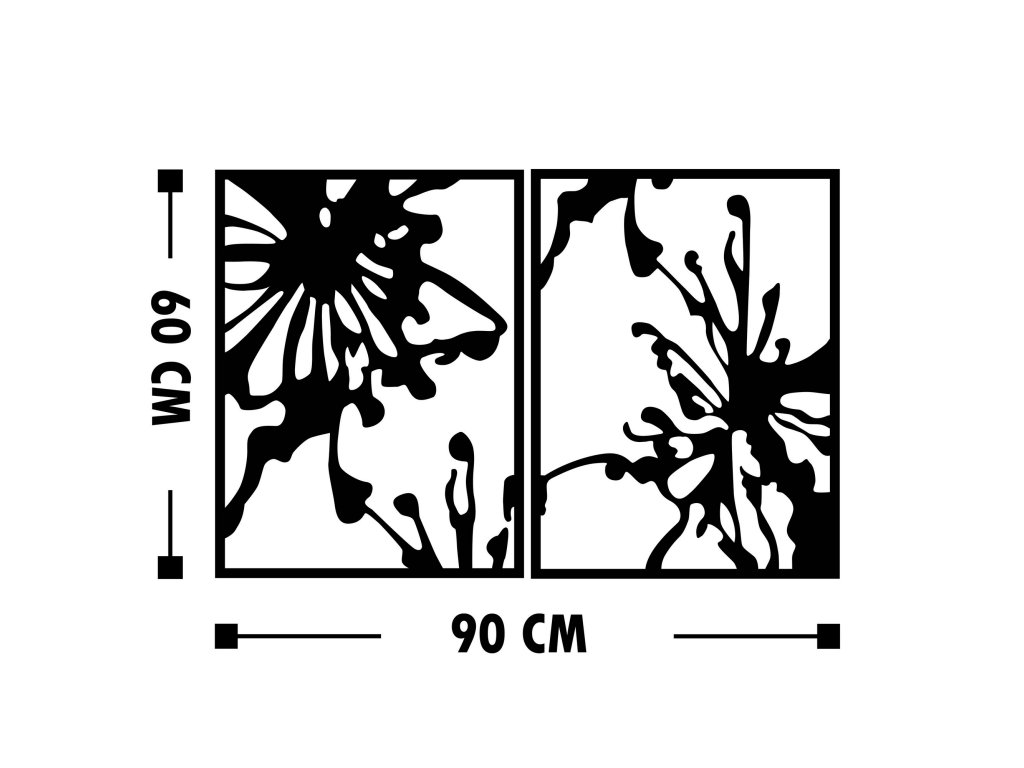 Abstraktní květy v rámu jsou námětem této dvoudílné černé kovové nástěnné dekorace.