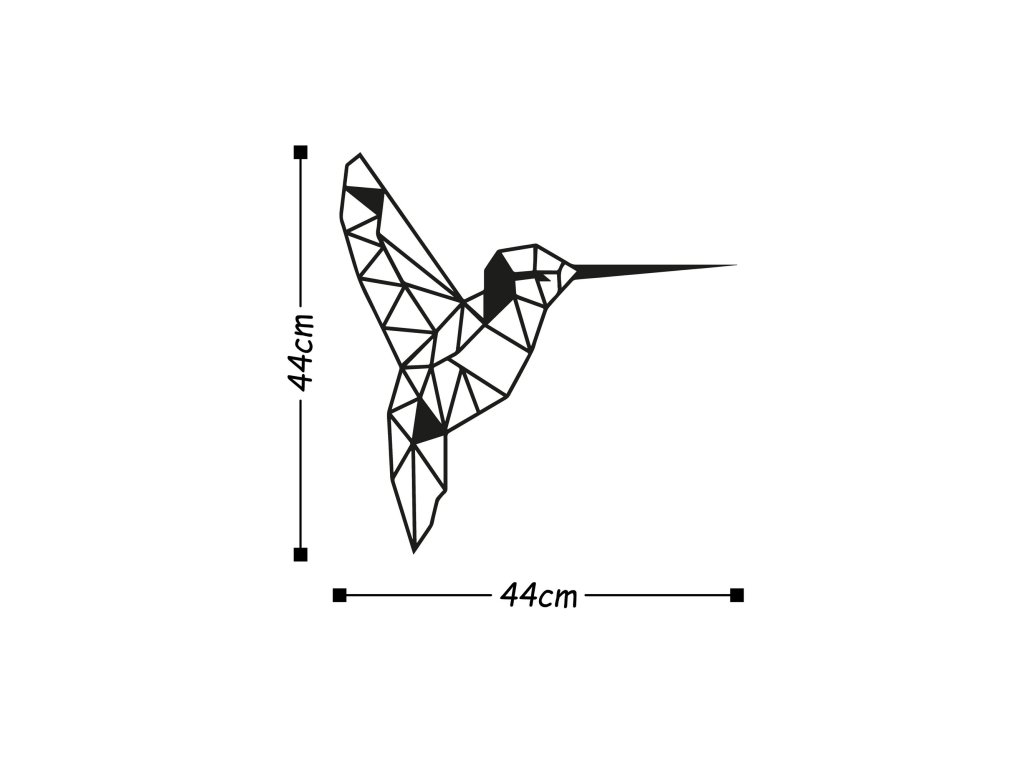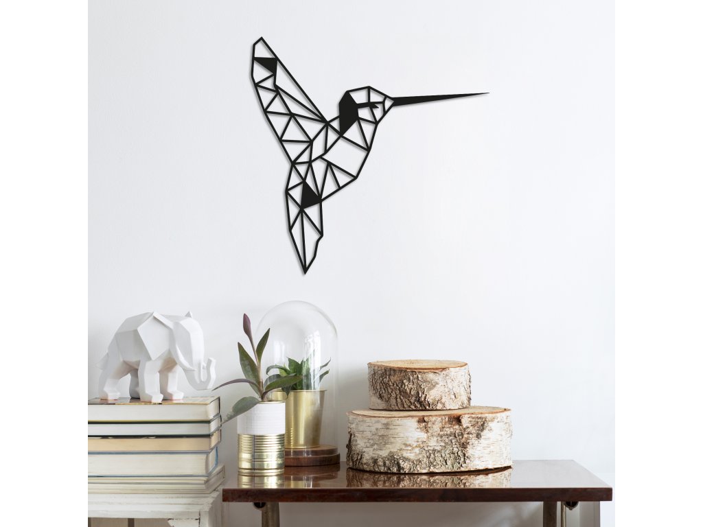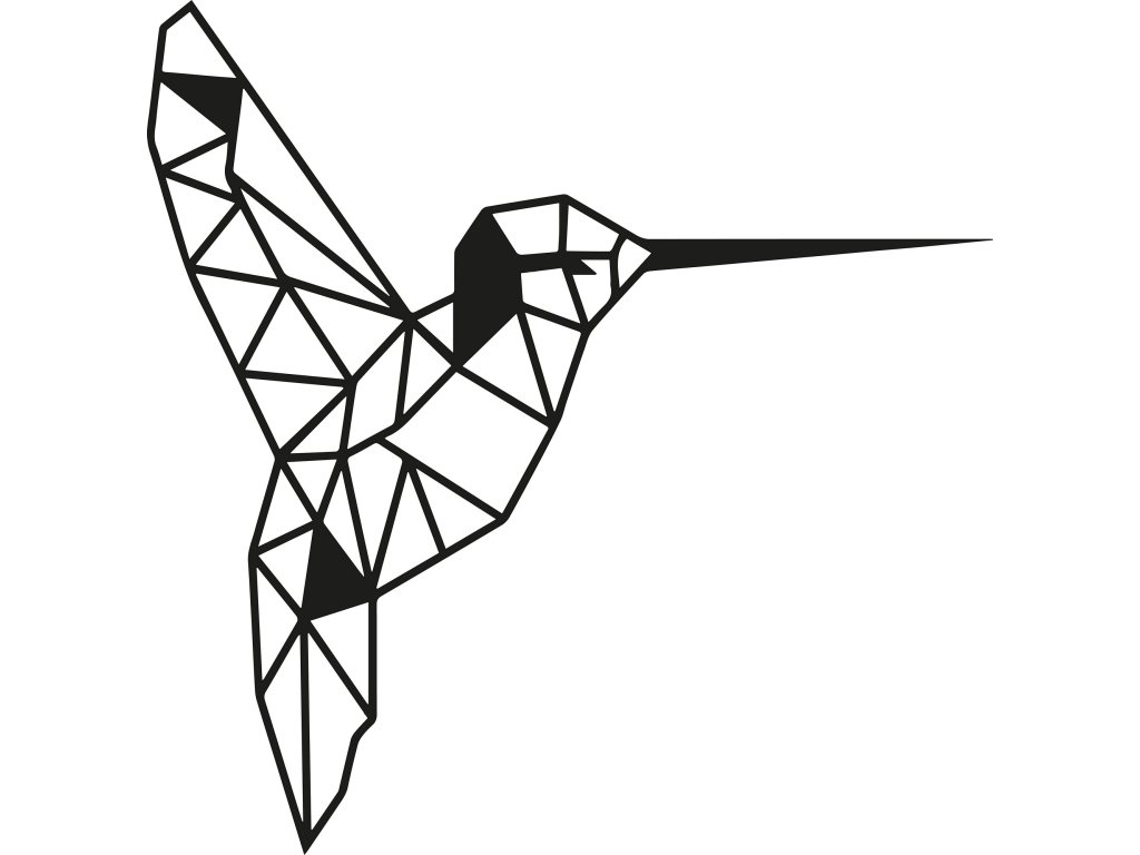 Z různě velkých černých kovových trojúhelníčků složené tělo kolibříka je tématem této nástěnné dekorace.