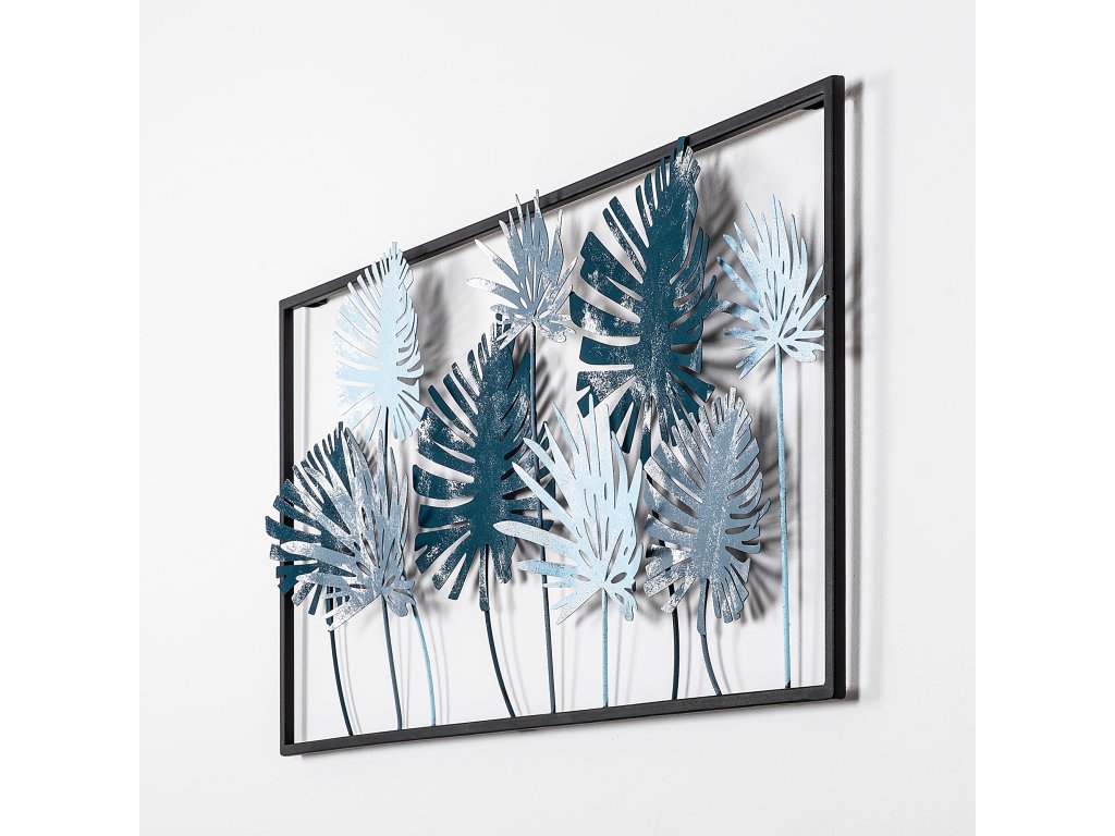 Různé listy rostlin vyrobené z kovových plátů odstínů modré barvy jsou uzavřené v obdélníkovém rámu a mohou do interiéru vnést elegantní nádech.