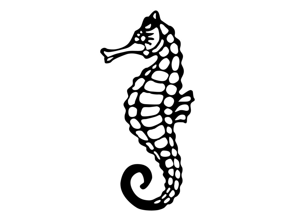 Z černého kovového plátu vyrobené tělo mořského koníka je tématem této nástěnné dekorace.