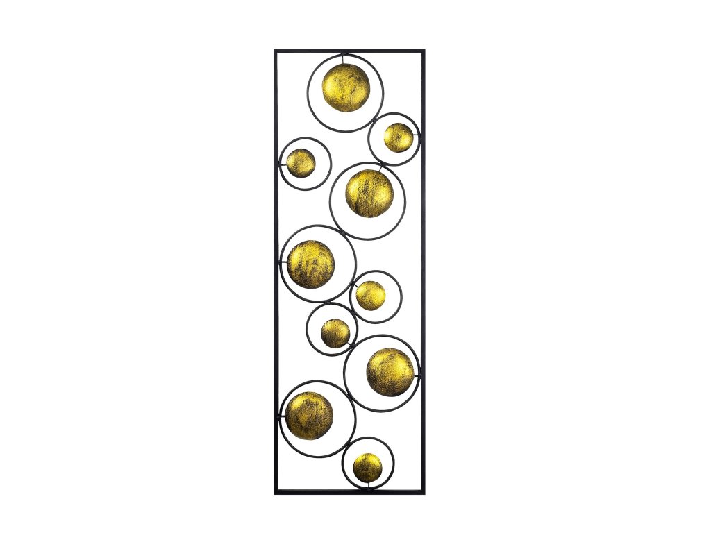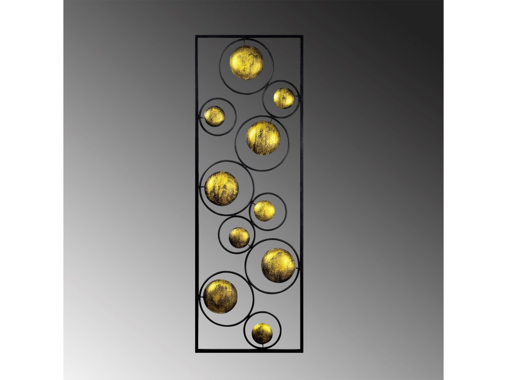 Ohraničený vesmír může být názvem této nástěnné dekorace, u které můžete s trochou fantazie vidět jednotlivé zlaté planety a jejich zlaté měsíce uzavřené v obdélníkovém rámu.
