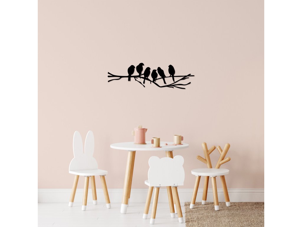 Siluety šesti ptáčků sedících na jedné holé větvi je tématem této nástěnné dekorace.
