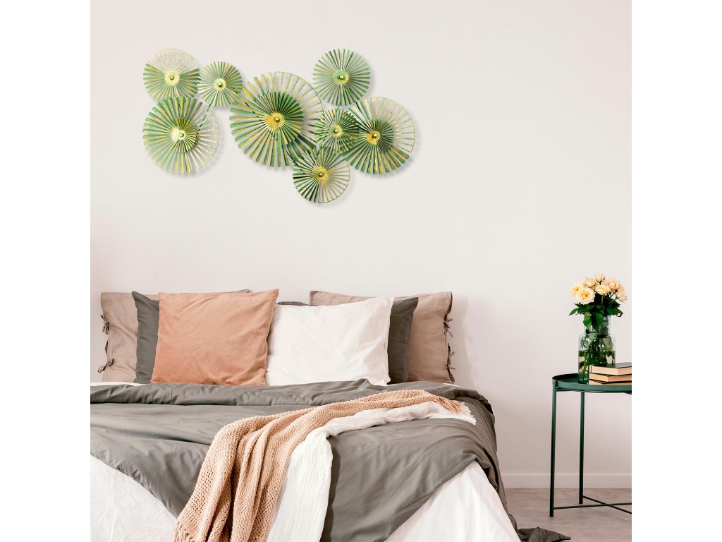 Jako soukolí s osmi zlato-zelenými různě velkými koly můžete vidět tuto velkou nástěnnou kovovou dekoraci.