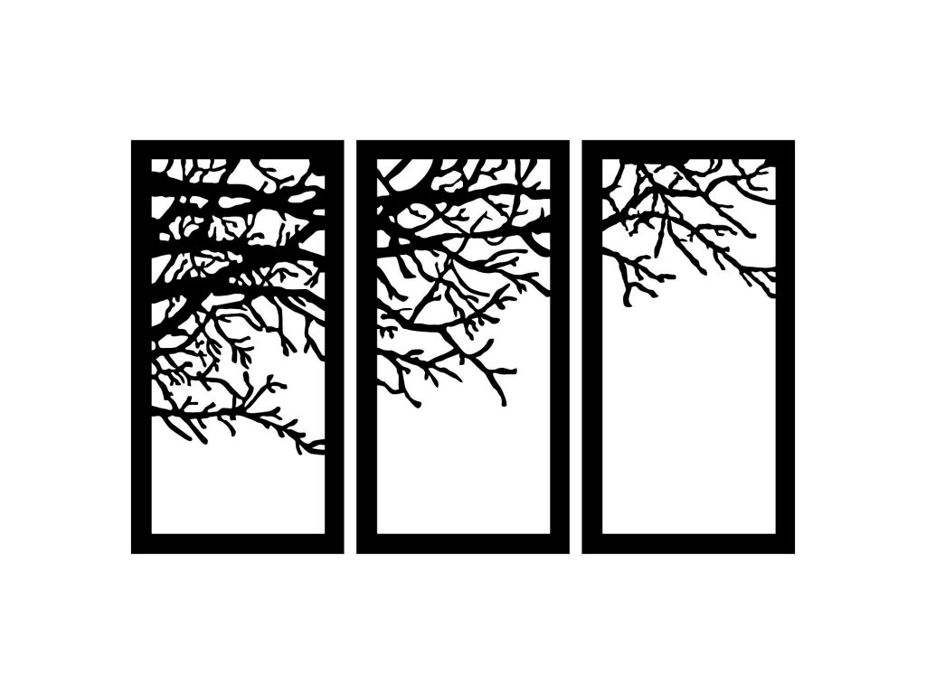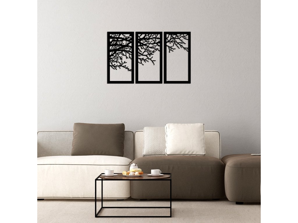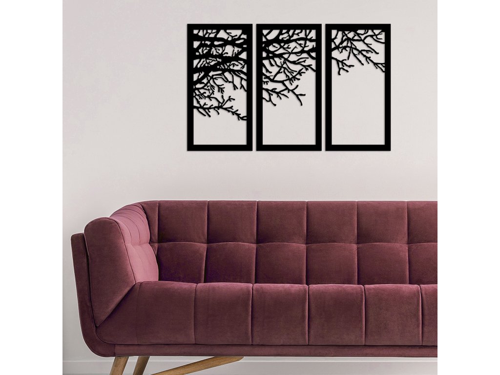 VĚTEV STROMU rozdělená do tří rámů je nástěnná kovová dekorace vhodná do jakékoliv místnosti.