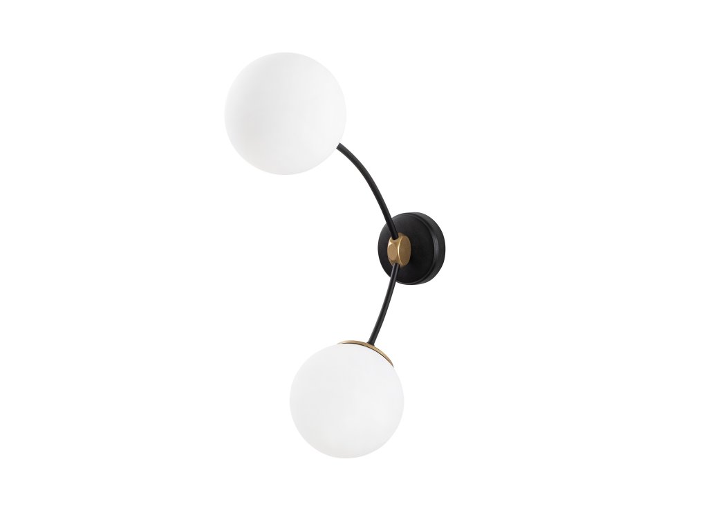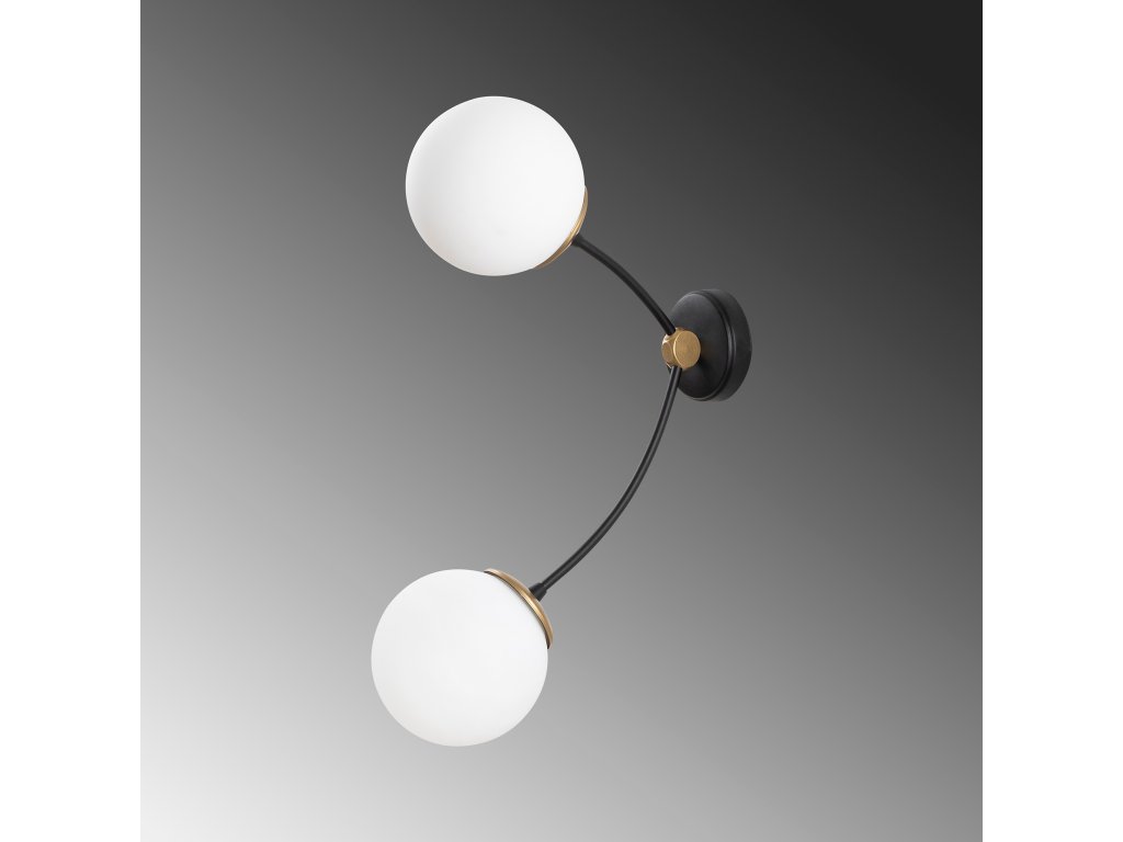 Nástěnné osvětlení KROMOZOM je vyrobené v černé barvě, kterou narušují jen zlatý kloub a víčka skleněných bílých stínítek.