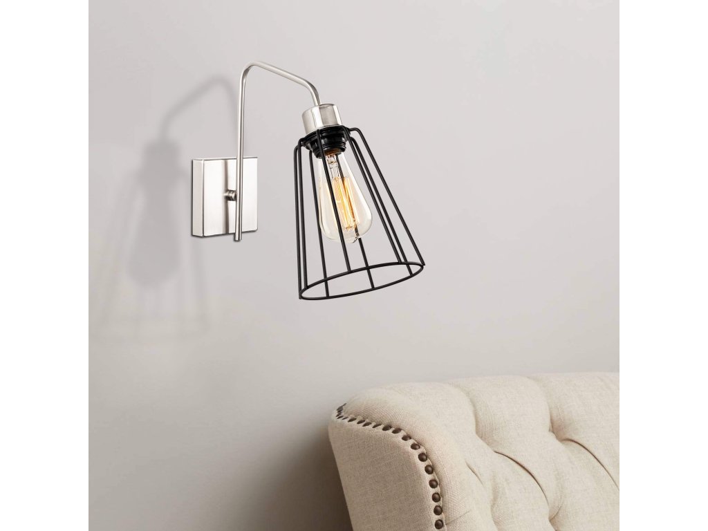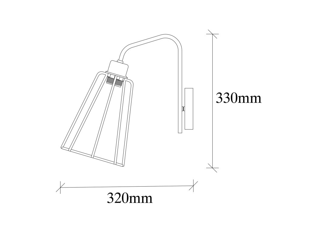 Nástěnné osvětlení VE je tvořeno čtvercovou základnou, krátkého ramene v niklové barvě a drátěným černým stínítkem.