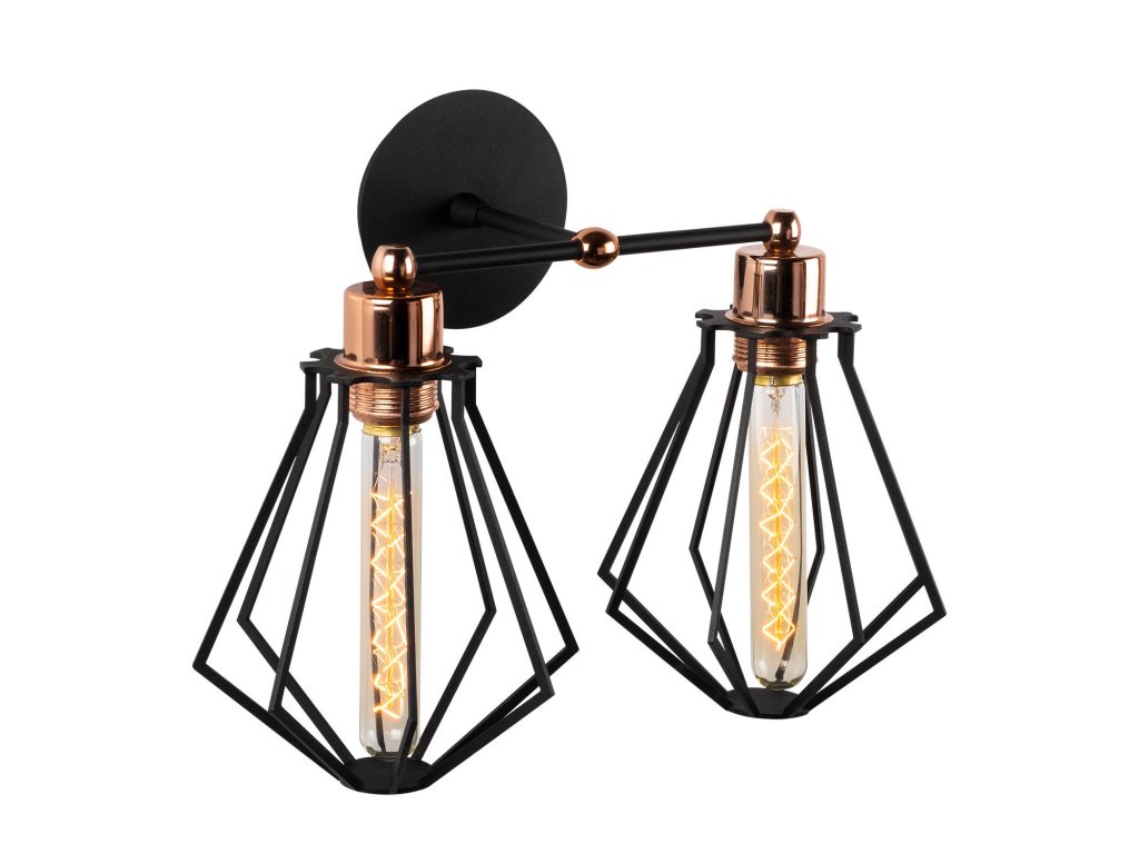 Nástěnné osvětlení OYLAT je tvořeno malou základnou a dvěma malým černými drátěnými stínítky.