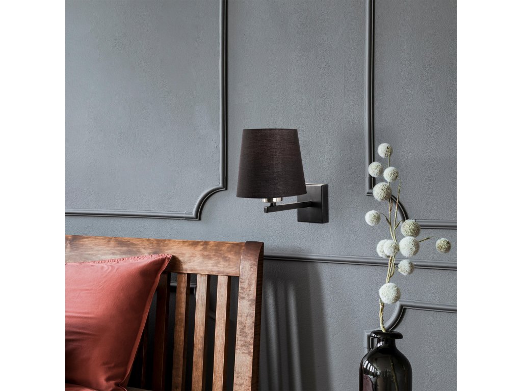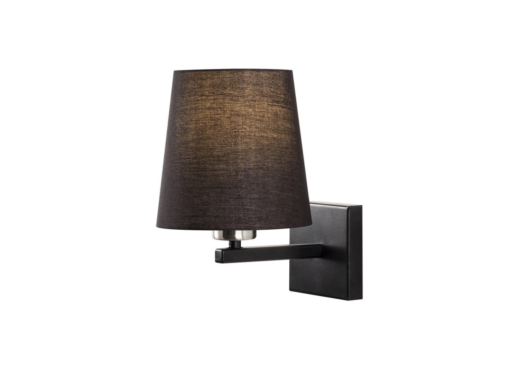 PROFIL je nástěnné osvětlení tvořené ze čtvercové základny, černého ramene, které vede přímo pod látkové hnědé stínítko kónického tvaru, kde drží niklovou objímku..