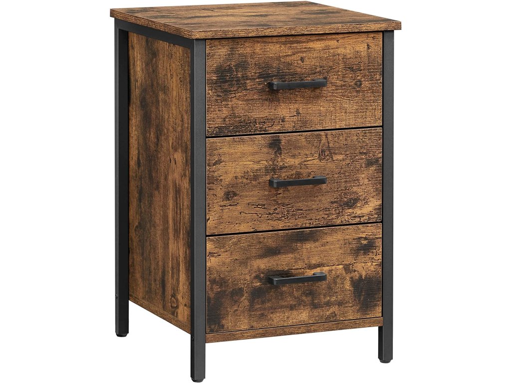 V dekoru rustikální hnědé barvy vyrobený noční stolek upevněný v černém rámoví nabízí jak odkládací desku, tak i tři zásuvky.