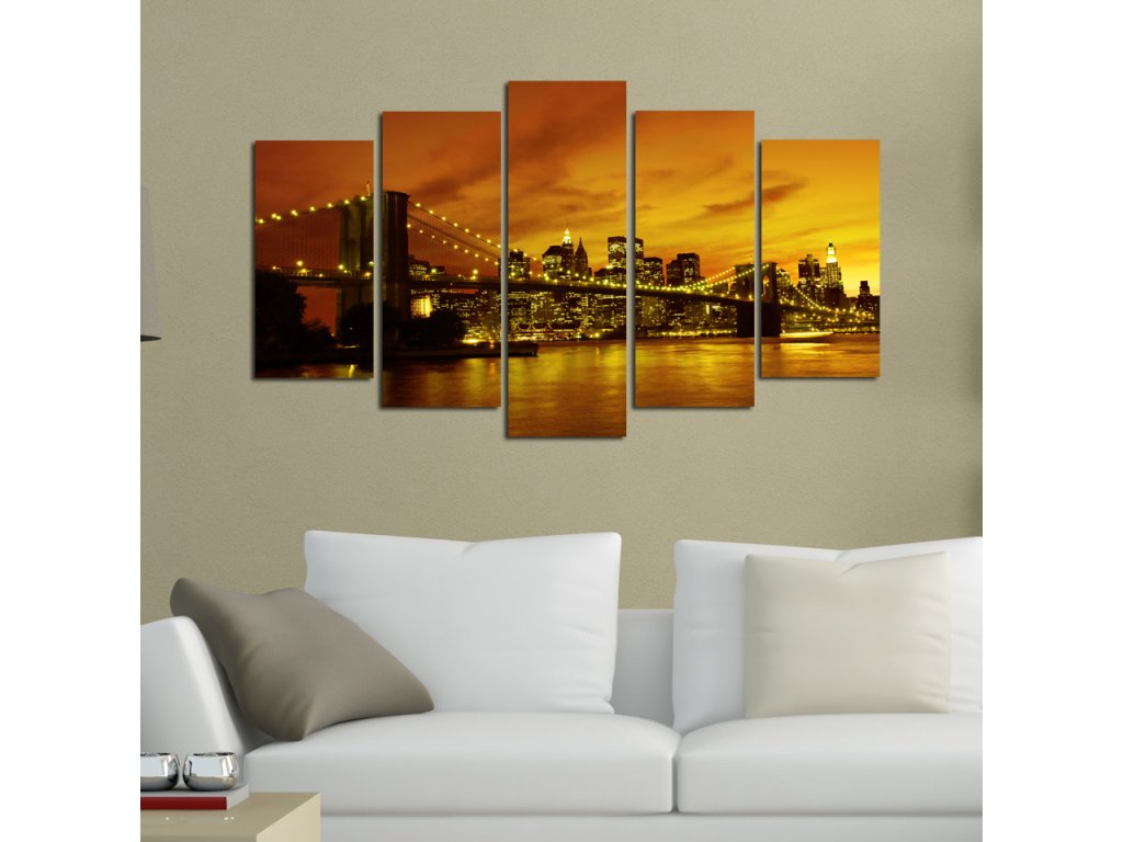 Večerní znázornění osvětleného mostu je tématem pětidílného obrazu, který dekorativně pozvedne i váš interiér.