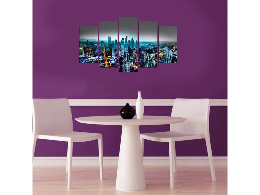 Letecký pohled na noční velkoměsto nabízí tento pětidílný obraz, který má potenciál ozdobit i větší místnosti.