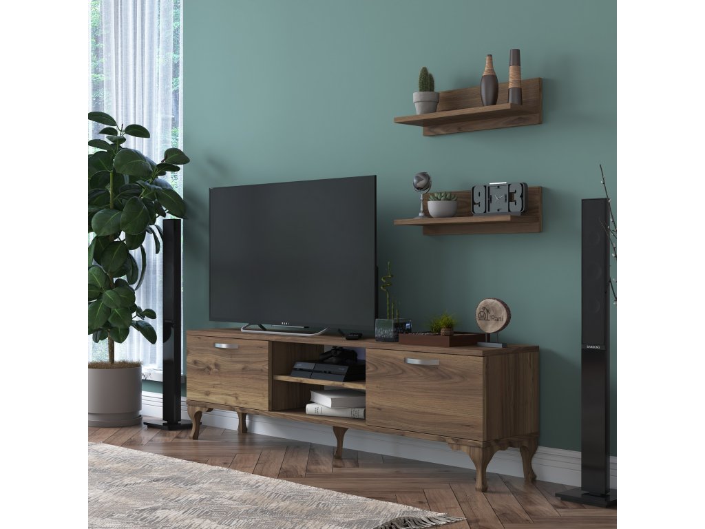 Obývací stěnu A4 tvoří televizní stolek v dekoru ořech a k němu příslušné dvě nástěnné police v témže dekoru.
