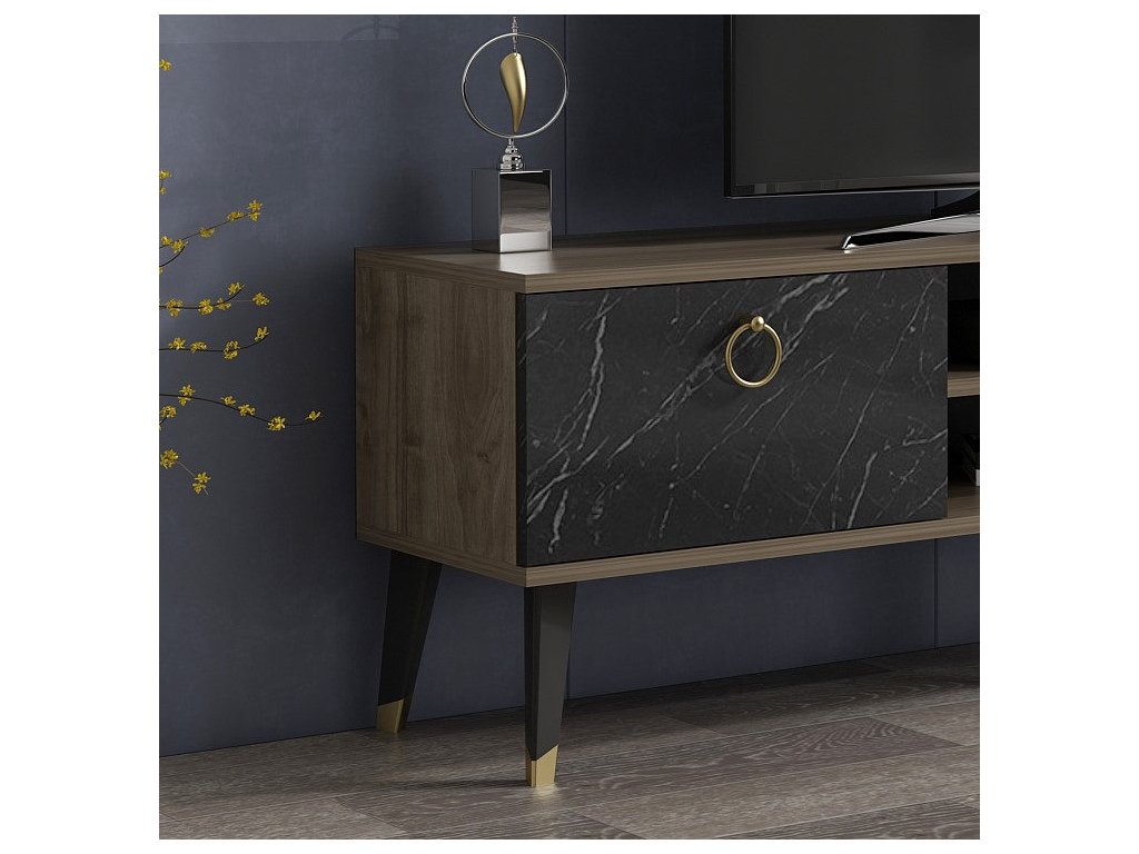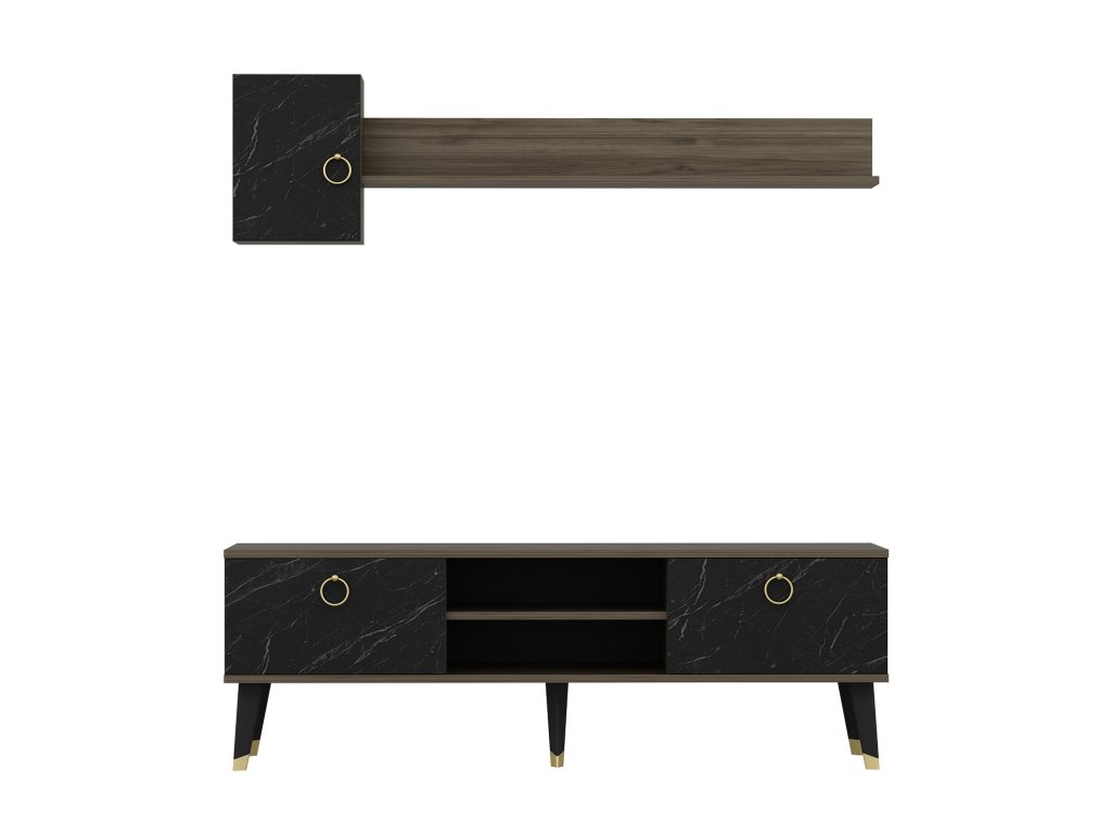 Obývací stěnu ALFA tvoří televizní stolek a k němu příslušná nástěnná uzavíratelná skříňka a dlouhá police vše v kombinaci dekorů ořech a černý mramor.