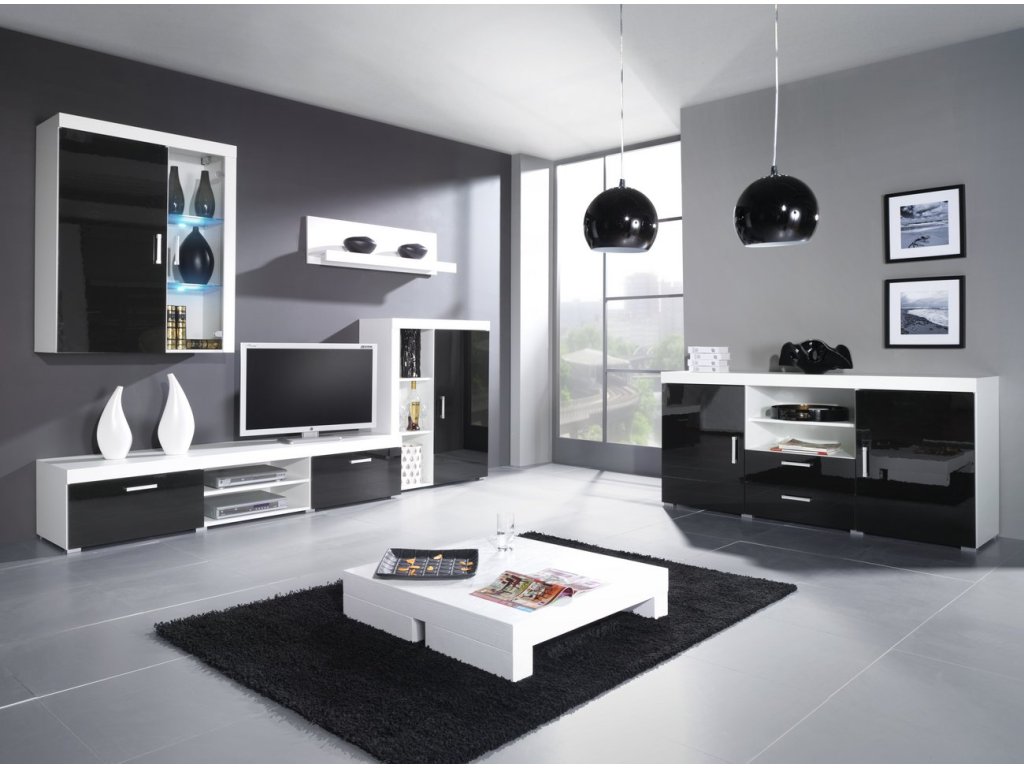 Moderní obývací stěna s TV stolkem, závěsnou vitrínou a poličkou v bílé nebo bíločerné barvě