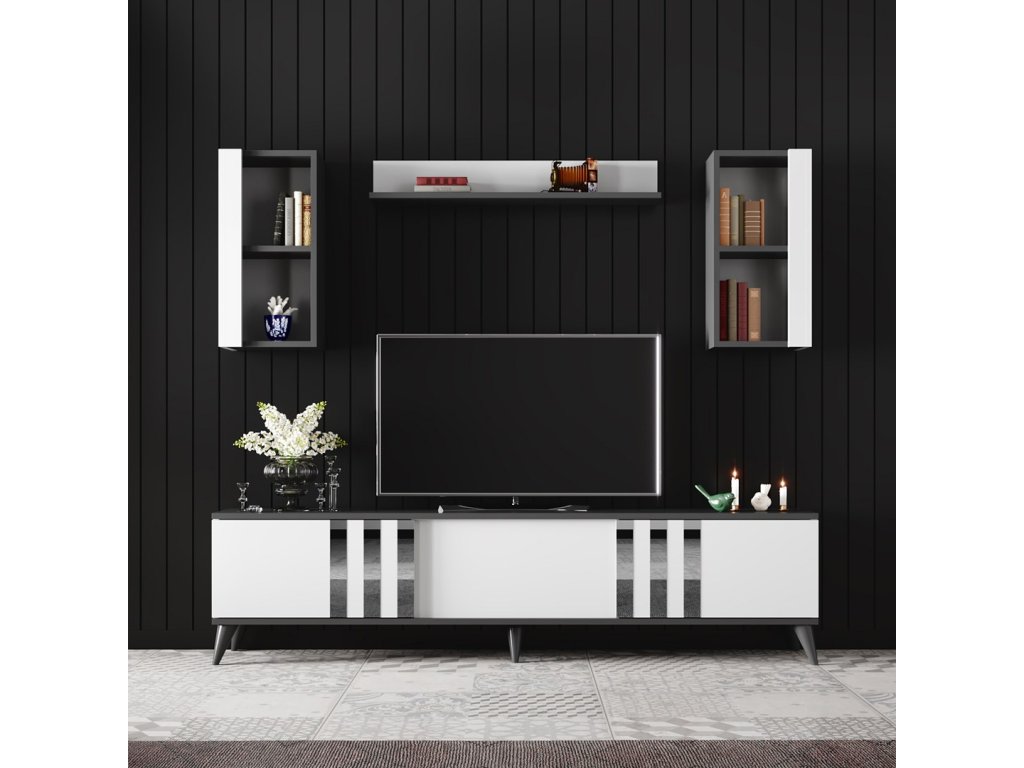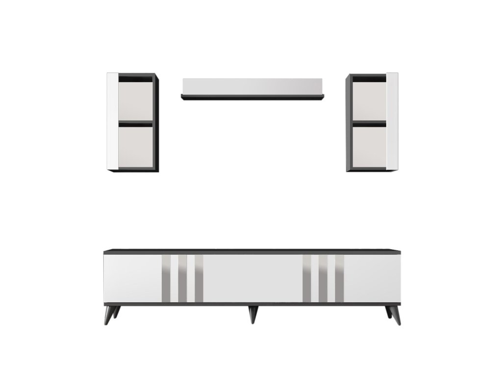 Bílo-antracitová obývací stěna CHROME se skládá z televizního stolku, jedné nástěnné police a dvou nástěnných skříněk.