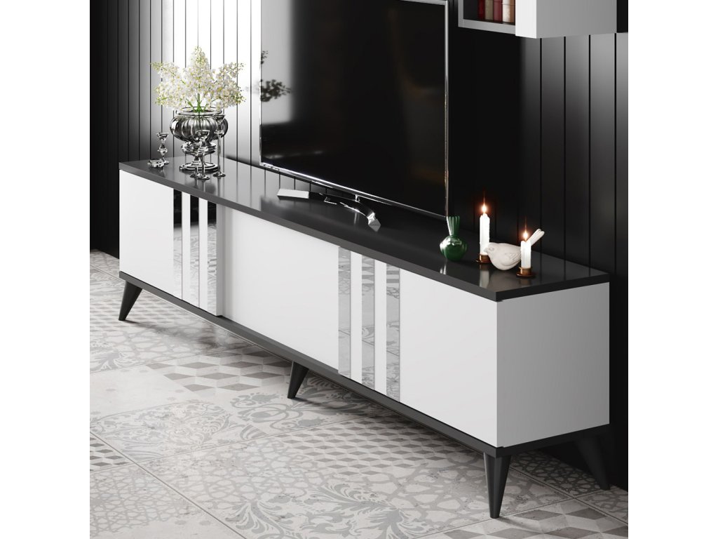 Obývací stěna CHROME nabízí designově elegantní prostor pro televizor s úložnými i odkládacími prostory vyrobenými v kombinaci bílé a antracitové barvy doplněnými o pochromované ozdobné proužky na dvířkách televizního stolku.