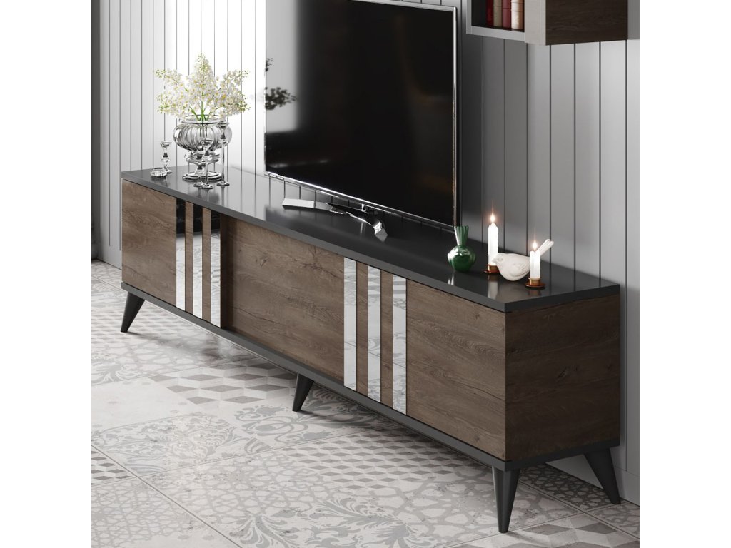 Obývací stěna CHROME nabízí designově elegantní prostor pro televizor s úložnými i odkládacími prostory vyrobenými v kombinaci dekoru ořech a antracitové barvy doplněnými o pochromované ozdobné proužky na dvířkách televizního stolku.