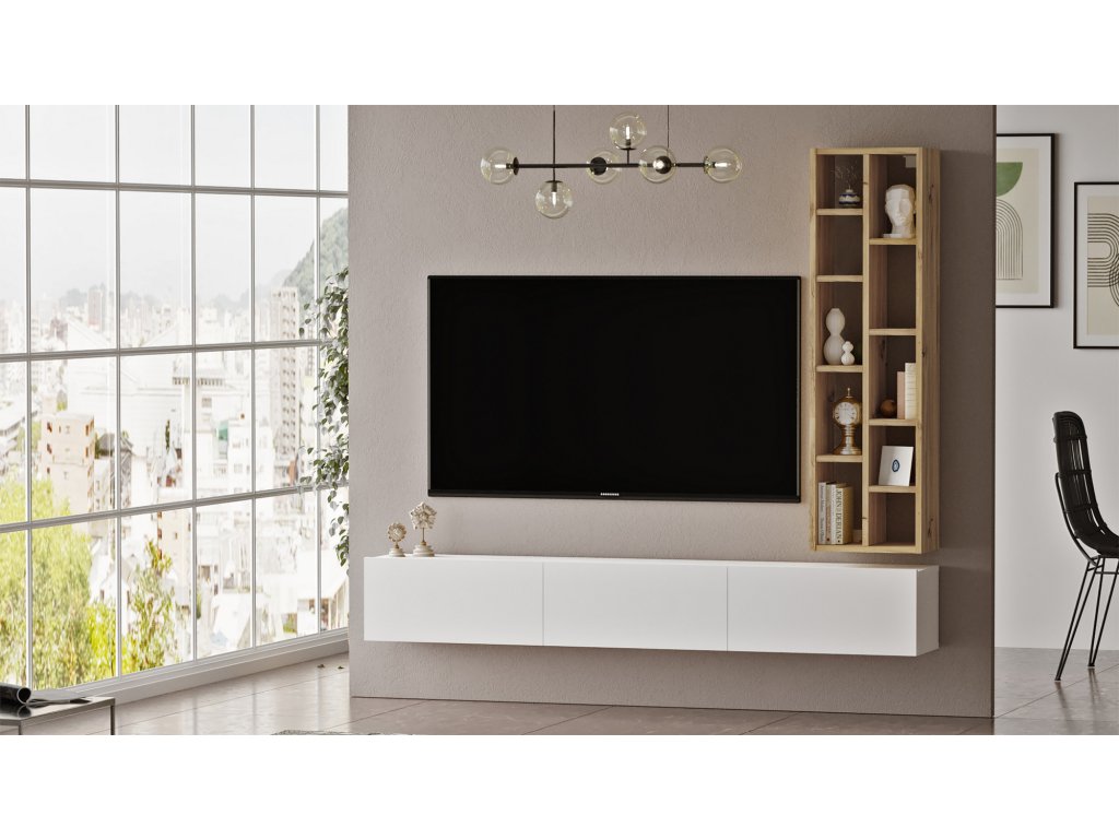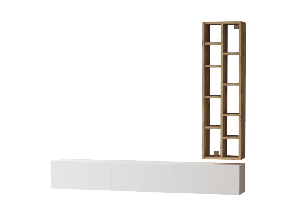 Nechte se zlákat moderní a jednoduchou obývací stěnou. Je vybavena dvěma nástěnnými policemi a pojme televizor a multimediální zařízení a zároveň vám poskytne optimální prostor pro uložení mnoha předmětů. Kombinace dřeva a bílé barvy a rafinovaný design vnesou do vašeho domova moderní nádech.