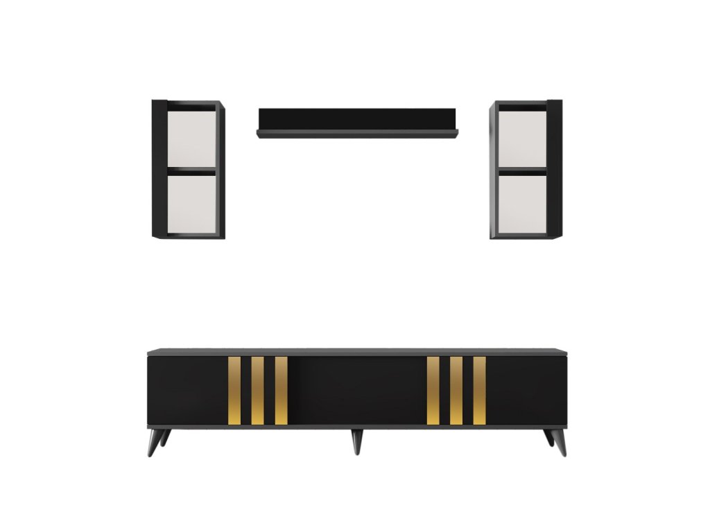 Černo-antracitová obývací stěna GOLD se skládá z televizního stolku se zlatými pruhy, jedné nástěnné police a dvou nástěnných skříněk.