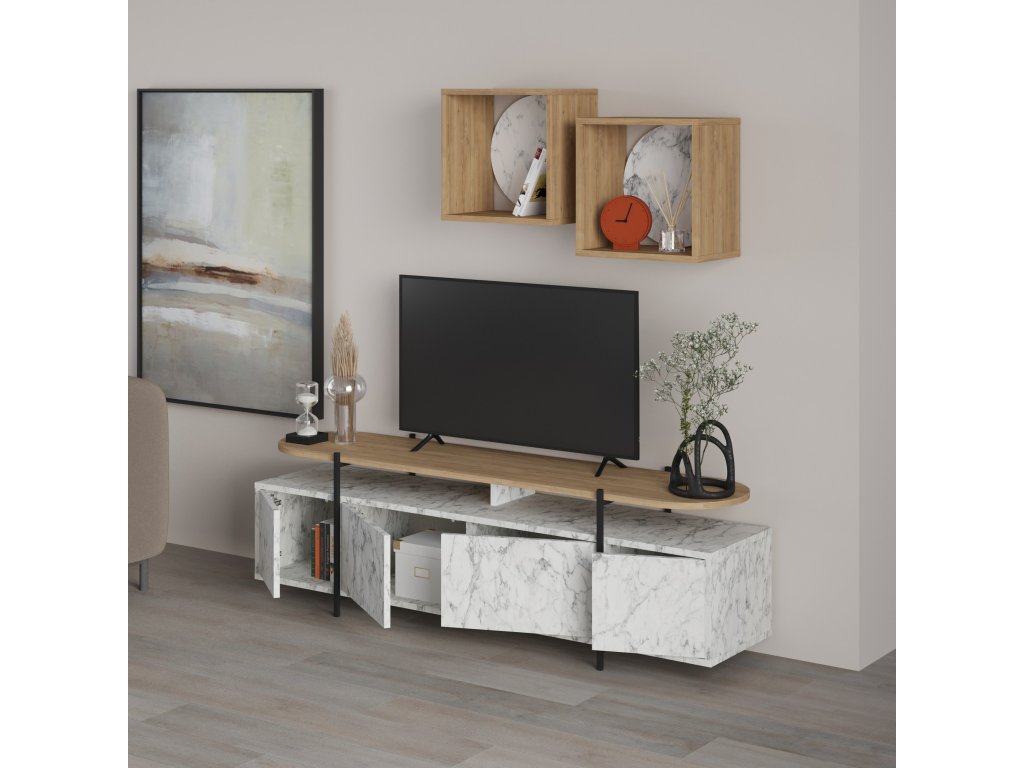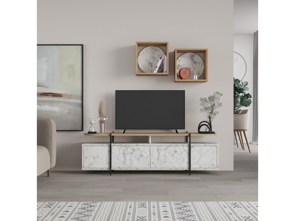 HANLEY patří mezi obývací stěny, které nabízejí v dekoru bílý mramor vyrobený televizní stolek složený ze tří skříněk, jedné dubové odkládací desky, kterou nad stolkem drží černé úzké kovové rámy současně sloužící jako nohy stolku. Stolek je doplněn o dva čtvercové nástěnné regály ve stejných dekorech, jako stolek.