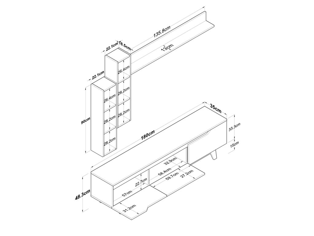 Rozměry TV jednotky: Šířka: 180 cm Hloubka: 35 cm Výška: 48,6 cm
