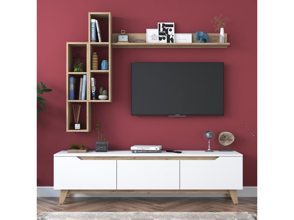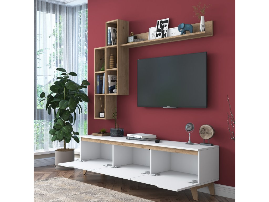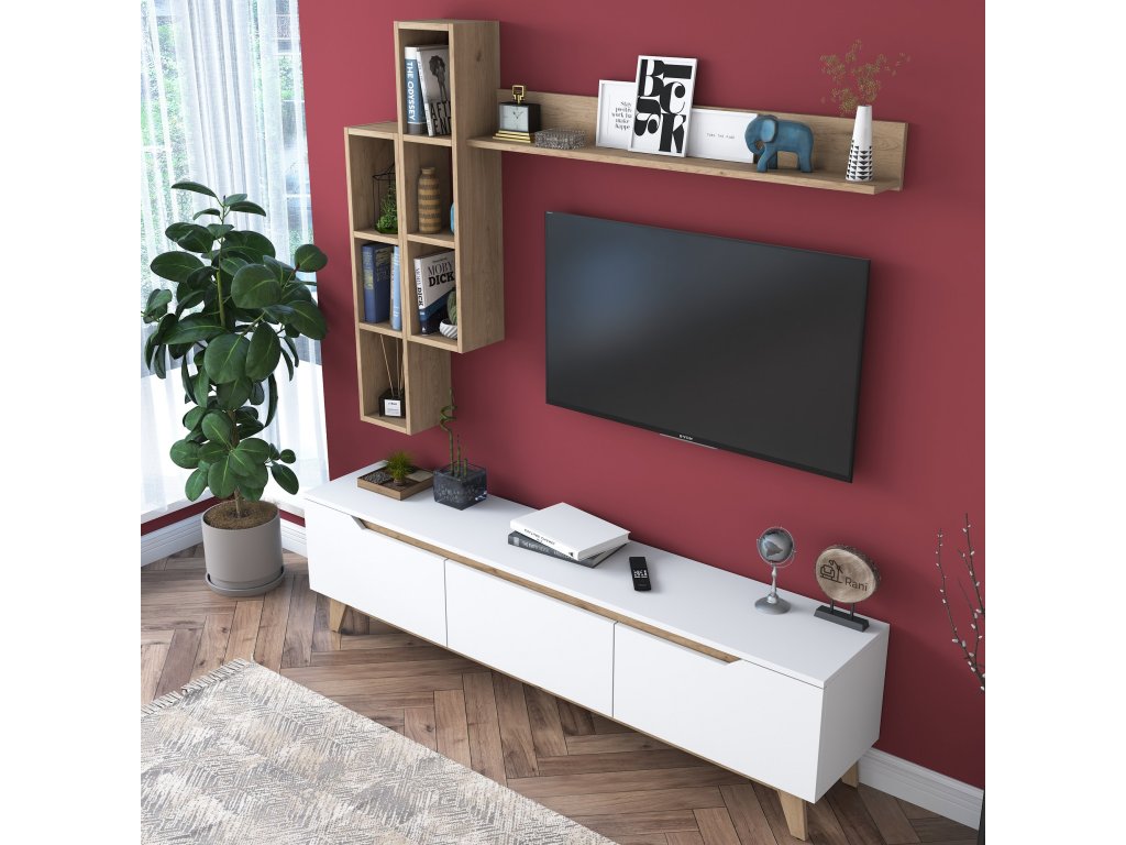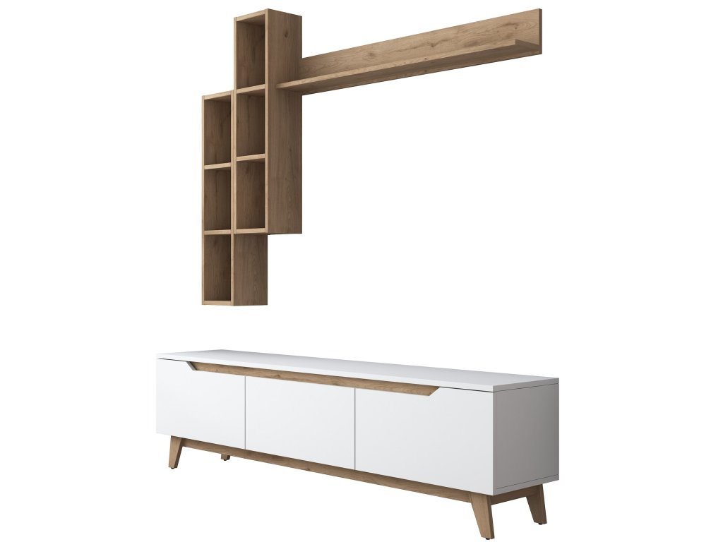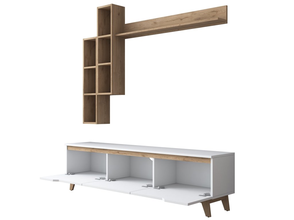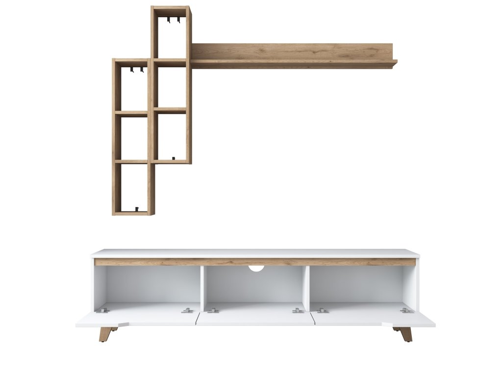 Obývací stěna M16 se skládá z televizního stolku tvořeného třemi skříňkami s výklopnými dvířky vyrobeného v kombinaci bílé barvy a dekoru ořech, jenž se opakuje i na příslušné nástěnné soustavě police s vertikálním regálem.
