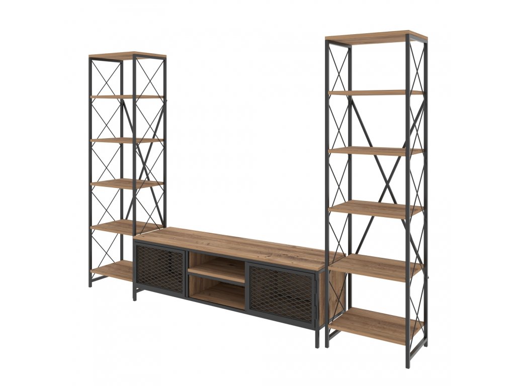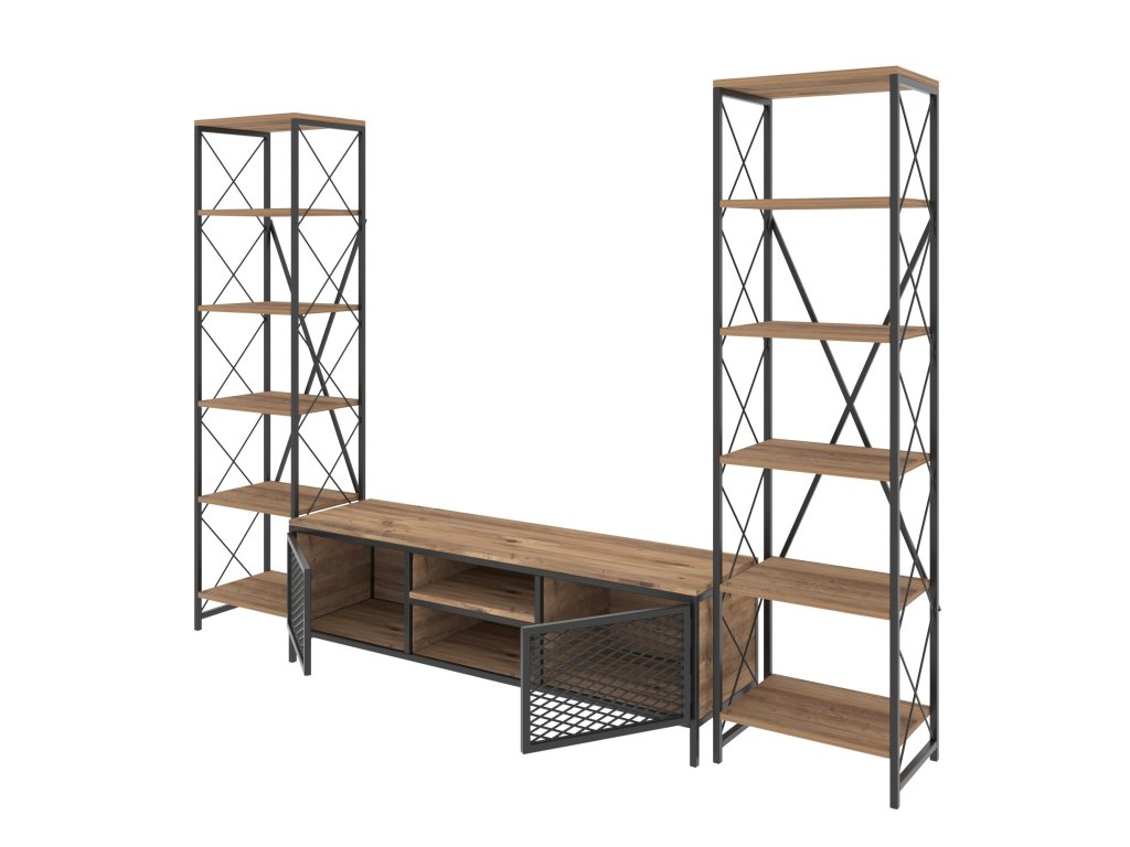 Obývací stěna tvořena z jednoho televizního stolku a dvou regálů v industriálním stylu