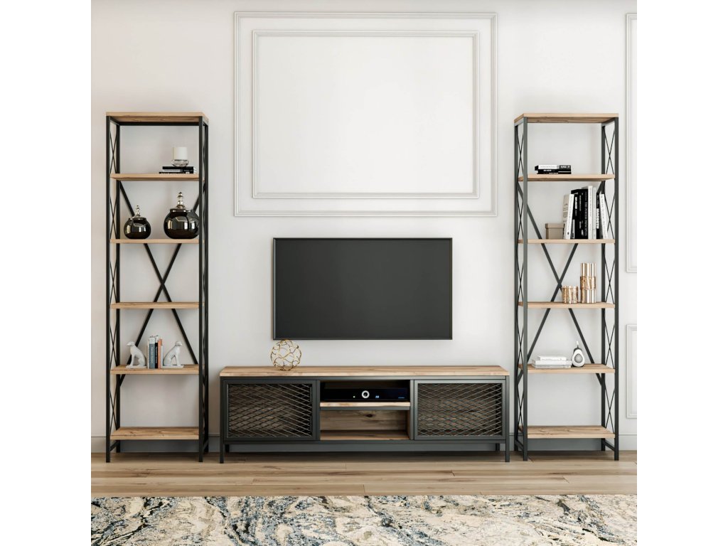 Tato obývací stěna je tvořena jedním televizním stolkem, který má 2 otevírací skříňky s originálními dvířky a 2 poličky, do kterých můžete uložit drobné věci.