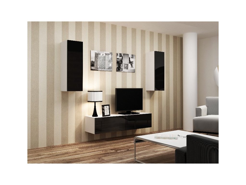 Moderní obývací stěna se skládá ze 2 závěsných skříněk a volně zavěšeným TV stolkem.