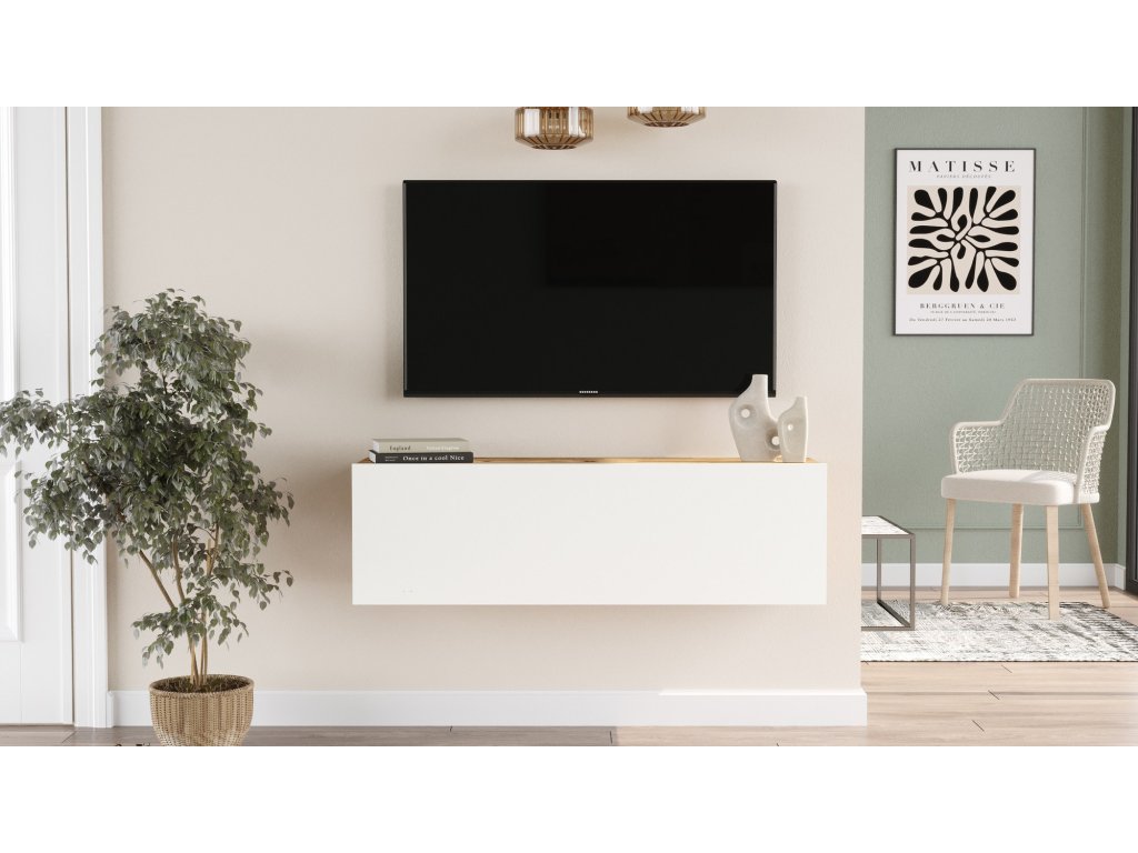 Televizní stolek FR12 je vyrobený v dekoru borovice atlantic a tvoří jej jedna skříňka schovaná za desku převyšujícími bálými výklopnými dvířky.
