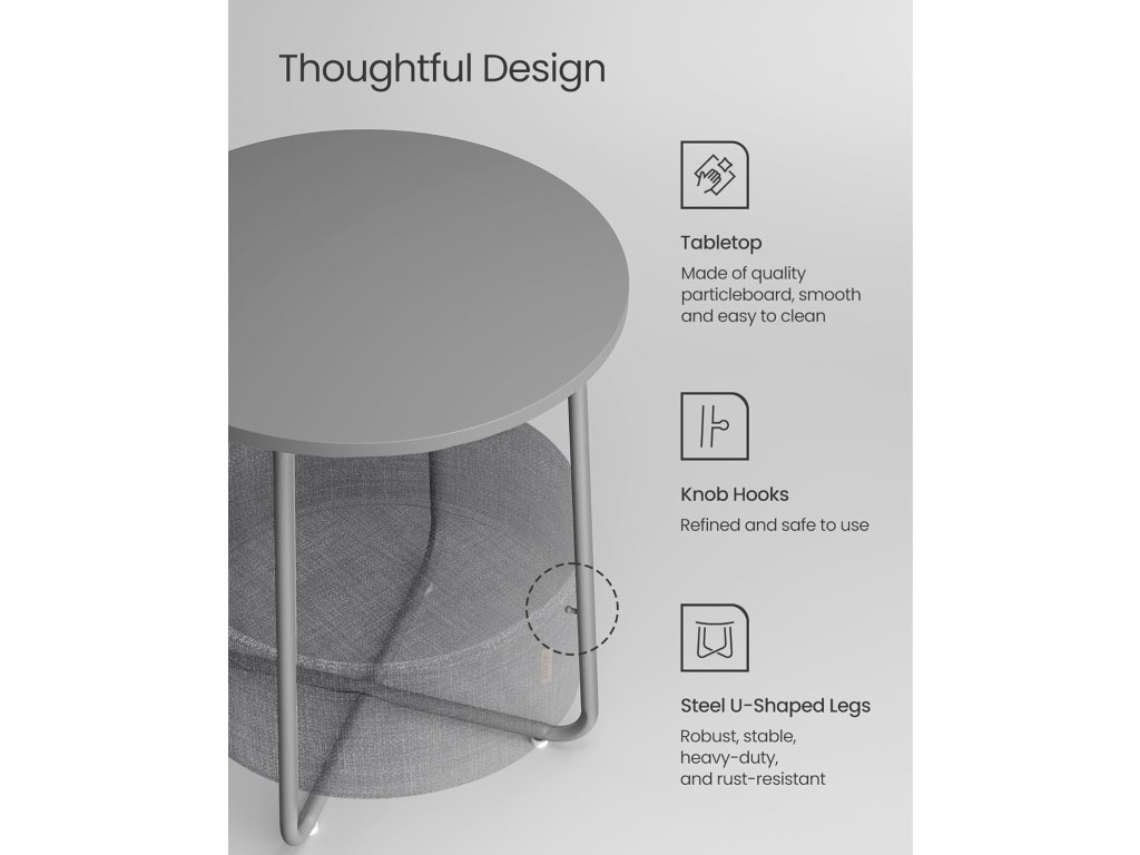 Jednoduchý odkládací stolek s kulatou deskou a kovovou konstrukcí šedé barvy je doplněn o vyjímatelný textilní košík ve stejné barvě