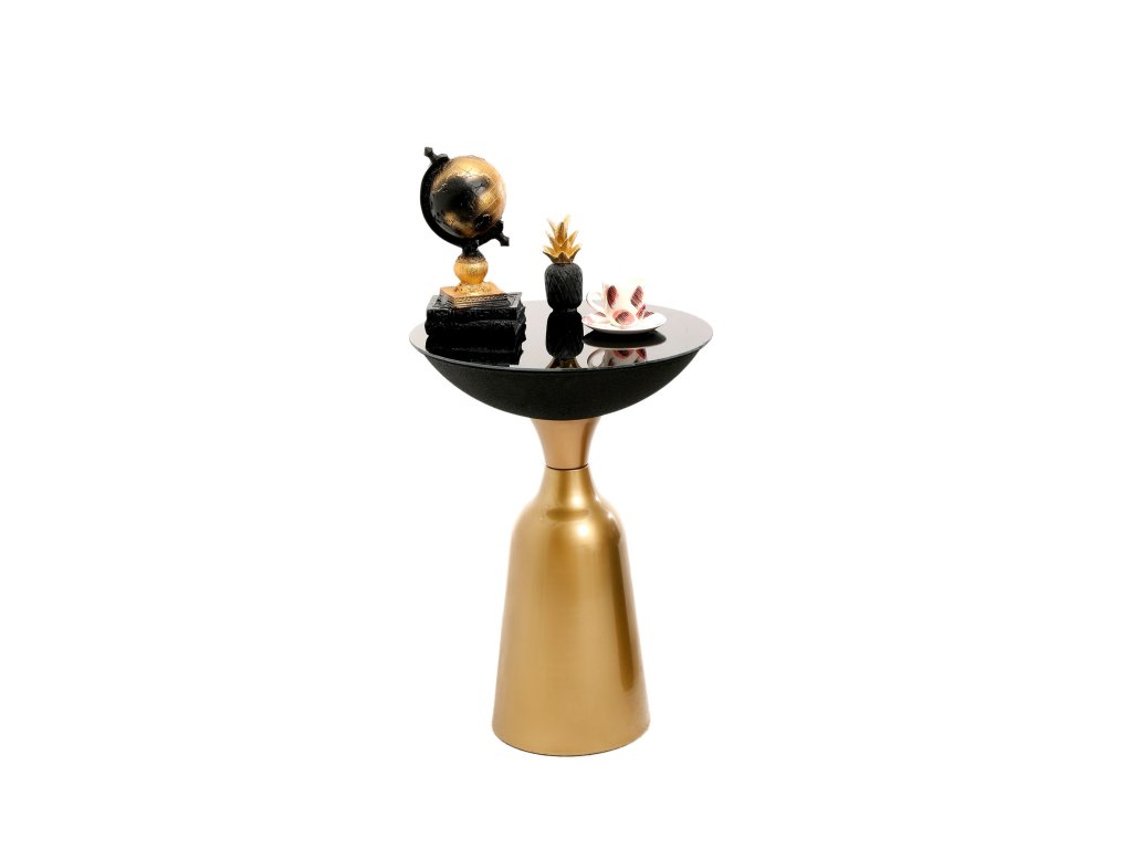 Designový odkládací stolek se stabilním kovovým tělem a skleněnou deskou.