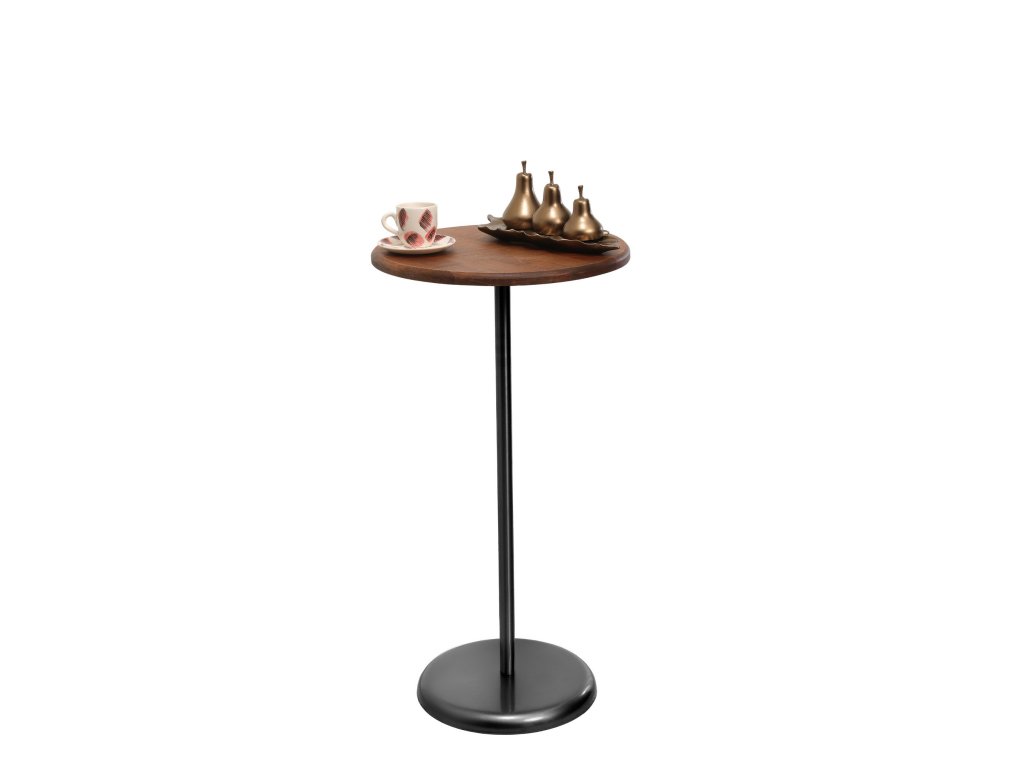 Odkládací stolek s deskou v dekoru ořech a kovovou konstrukcí.