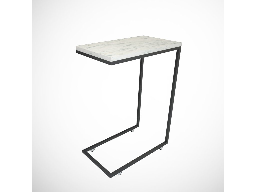 Z černé kovové konstrukce je vyrobený odkládací stolek s bílou odkládací deskou.