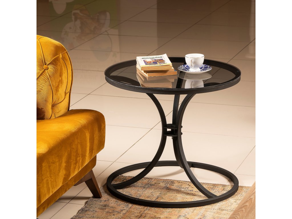Odkládací stolek CORLEAONE je vyrobený z černého kovového rámu a kruhové desky z kouřového tvrzeného skla.