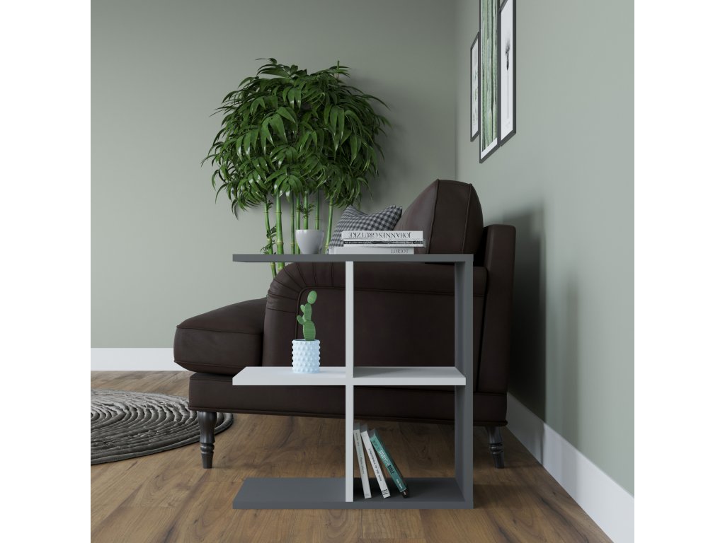 Víceúčelový antracitový odkládací stolek HAMLET je vyrobený s bílými příčkami vloženými do z jedné strany neukončeného dvoupatrového regálu.