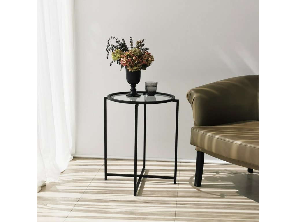 Moderní černý kovový odkládací stolek S412 s kruhovou čirou skleněnou deskou Vás upoutá svým designem, je strohý a současně velice praktický.