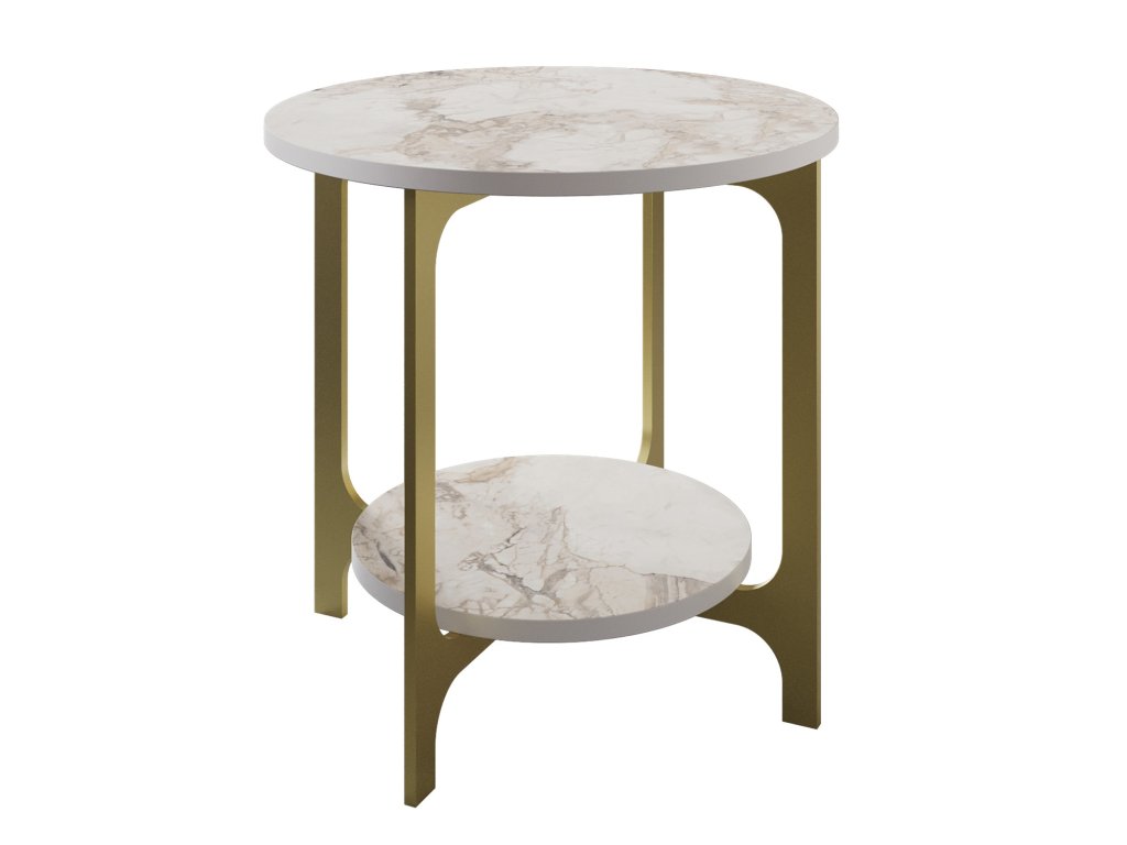 Do světlých barev laděný konferenční stolek VERSY je tvořen dvěma kruhovými deskami v dekoru bílého mramoru usazenými do kovového rámoví nohou zlaté barvy.