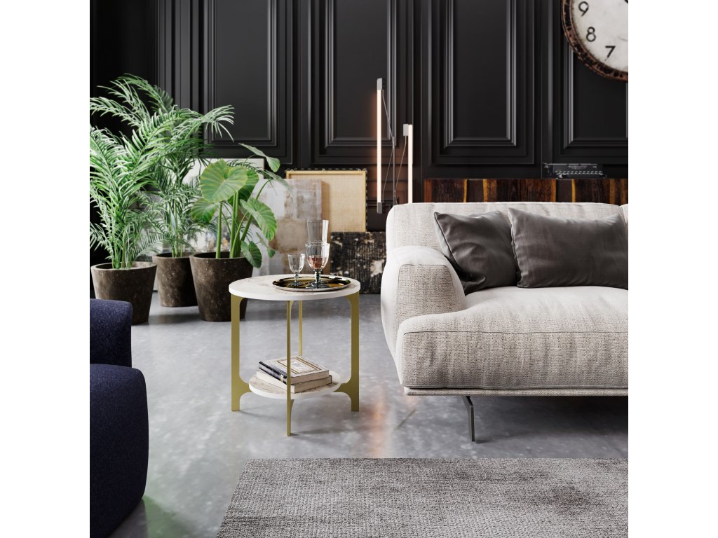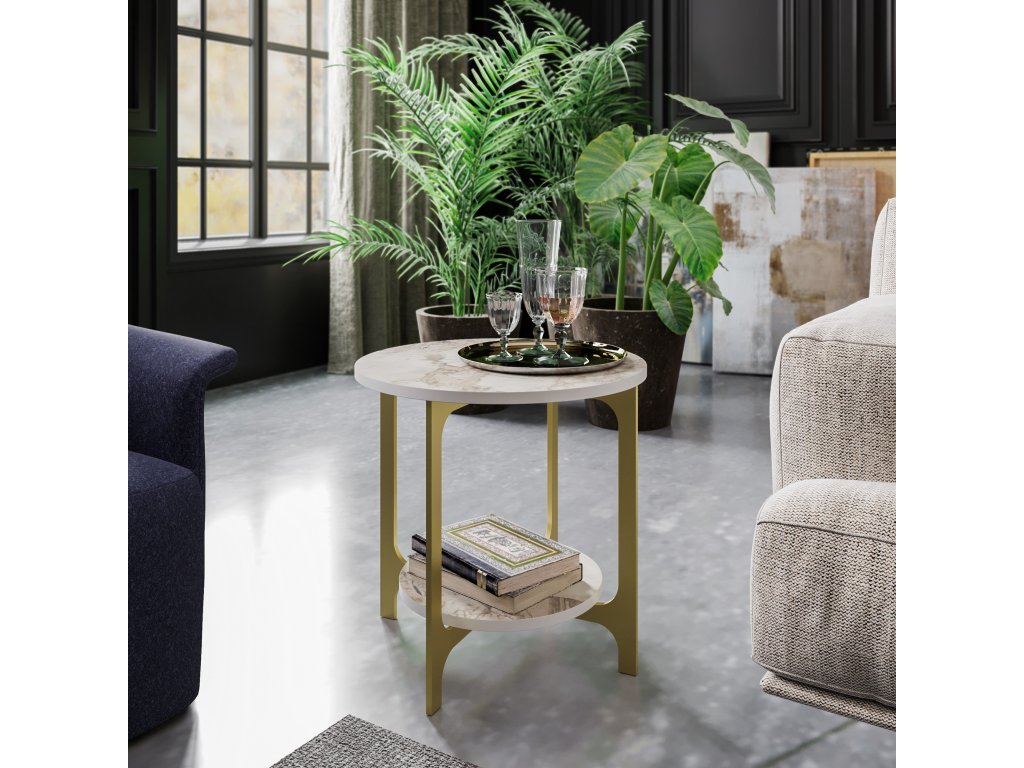 Odkládací stolek VERSY je vyrobený v kombinaci zlaté barvy a bílého mramoru a bude tak umocňovat moderní styl místnosti, do které jej postavíte.