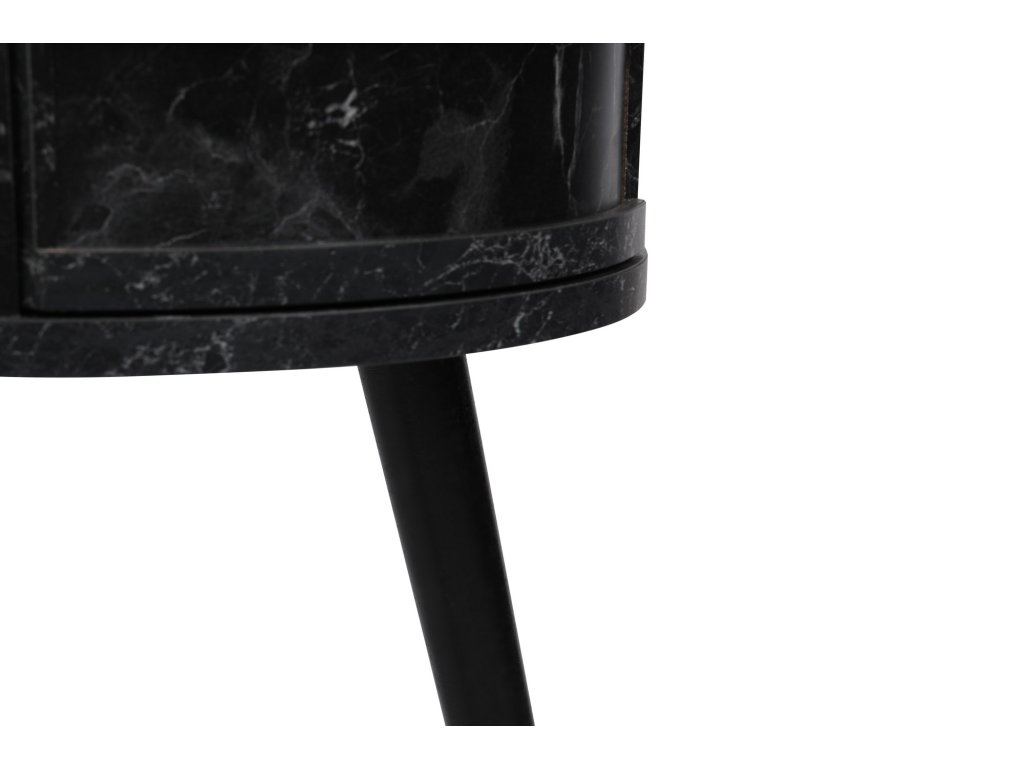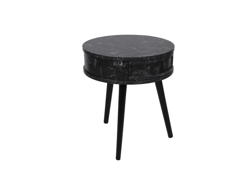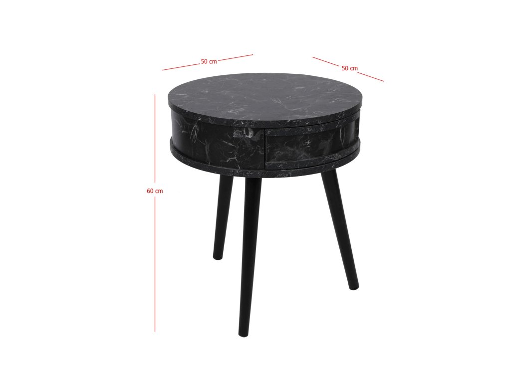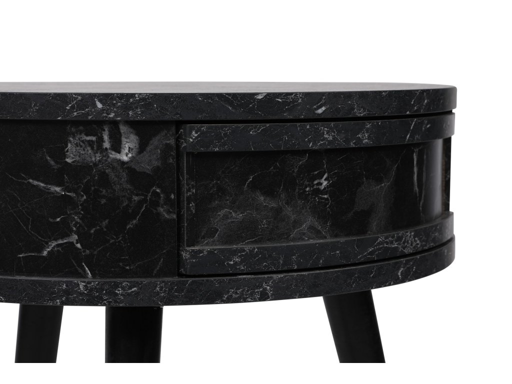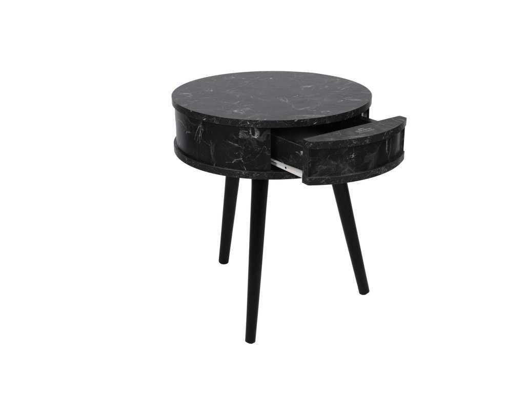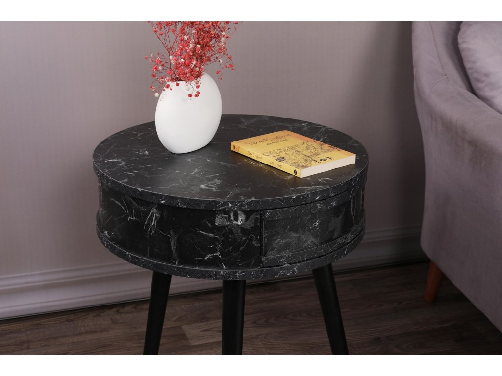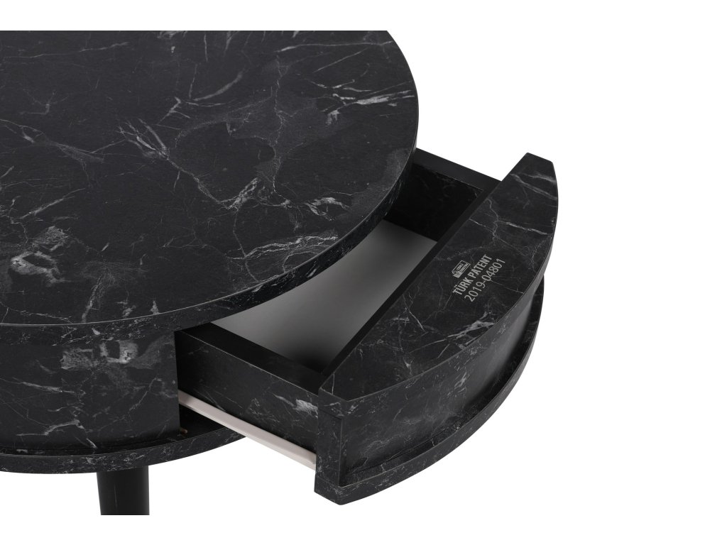 YUVARLAK je černý odkládací stolek, jenž je vyroben v dekoru černého mramoru a nabízí nejen odkládací desku, ale i tajnou zásuvku.