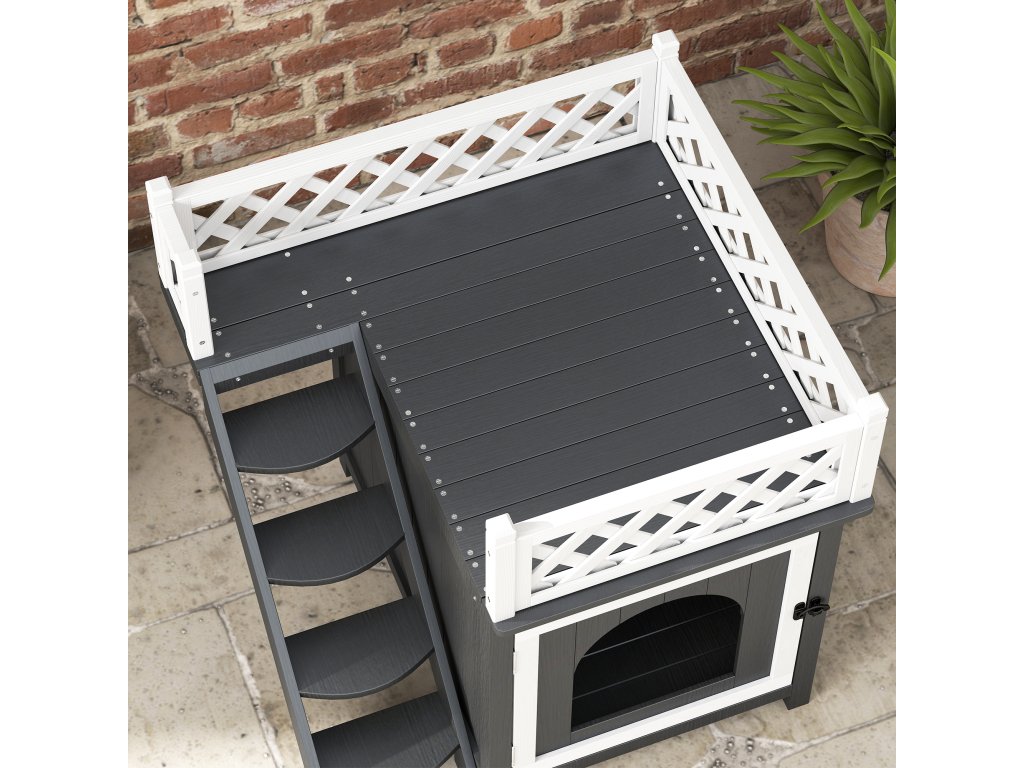 Útulný kočičí domeček v přízemí a prostorný balkon v patře, obklopený ozdobným plotem. Schodiště v kočičím domečku propojuje obě patra a usnadňuje lezení – ideální pro hraní a relaxaci.